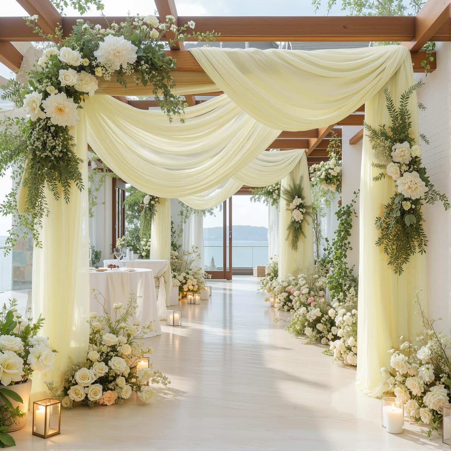 • Sheer Backdrop Curtain Fabric: 1-pack, each panel measures 28inch wide x 19ft long. Wedding arch draping fabric are made of unique ivory chiffon fabric with a slight sheen, 100% wrinkle-resistant polyester. They are silky soft and more elegant than tulle or nylon fabrics
