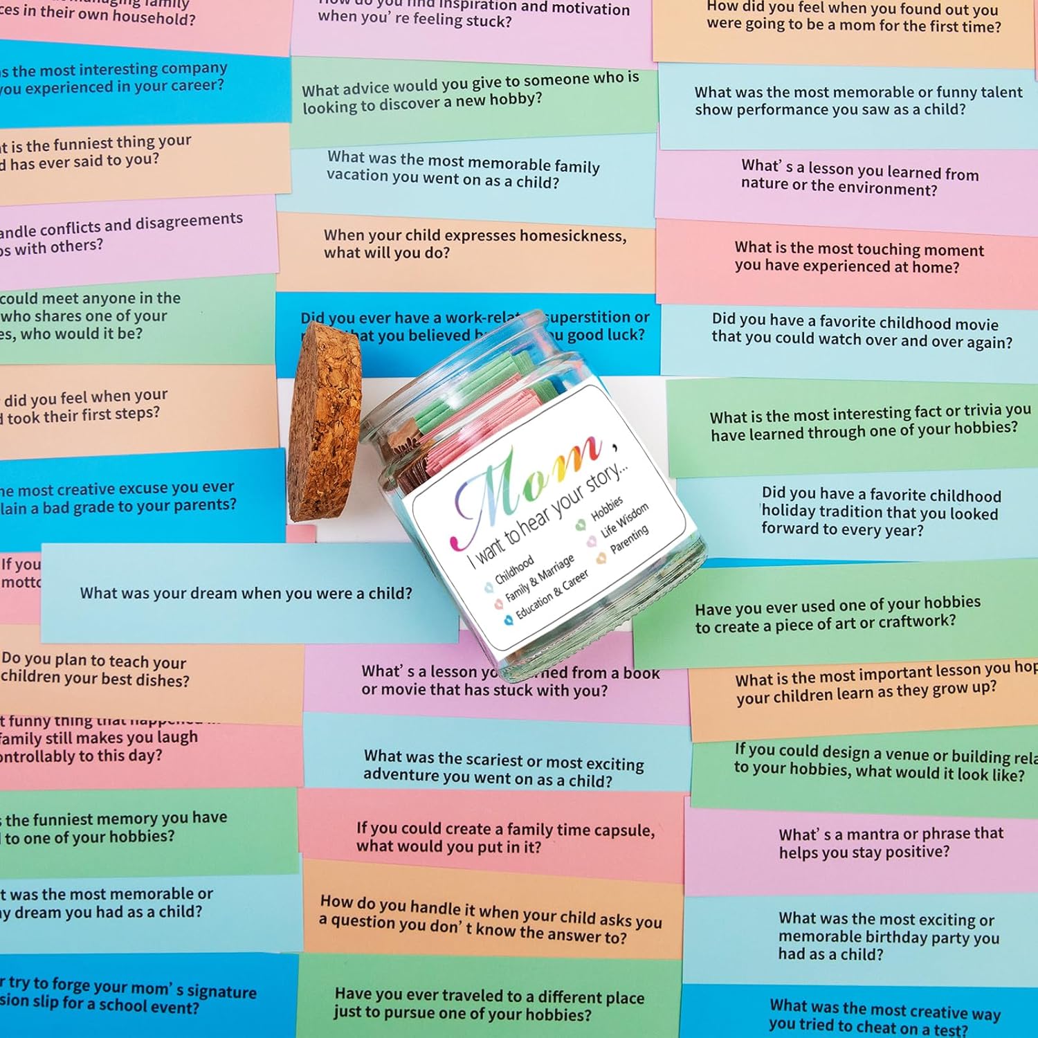 • Exquisite Appearance Presentation: This "Mom, I want to hear your story" jar has a simple yet elegant shape. The glass jar body is crystal - clear, like pure crystal, making the carefully classified colorful question notes inside stand out. The edges of the jar are finely polished, smooth and round, with a comfortable hand feeling. The lid fits tightly with the jar body, opening and closing smoothly, which not only ensures the tightness of the product but also adds to the convenience of use