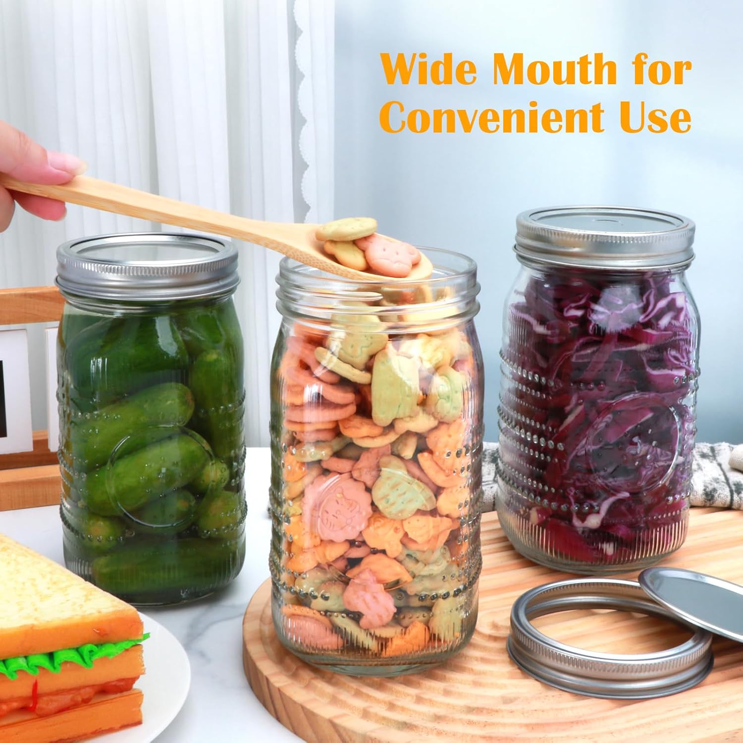 • Wide Mouth and Airtight Metal Lids:These wide mouth mason jars with lids and bands feature silver metal lids that seal tightly to keep your food fresh longer. Ideal for both water bath and pressure canning and keep your pickles,jams,or dry goods fresh and flavorful.The wide opening makes it simple to insert fruits or vegetables and remove them as needed,ensuring a hassle-free fermentation process every time