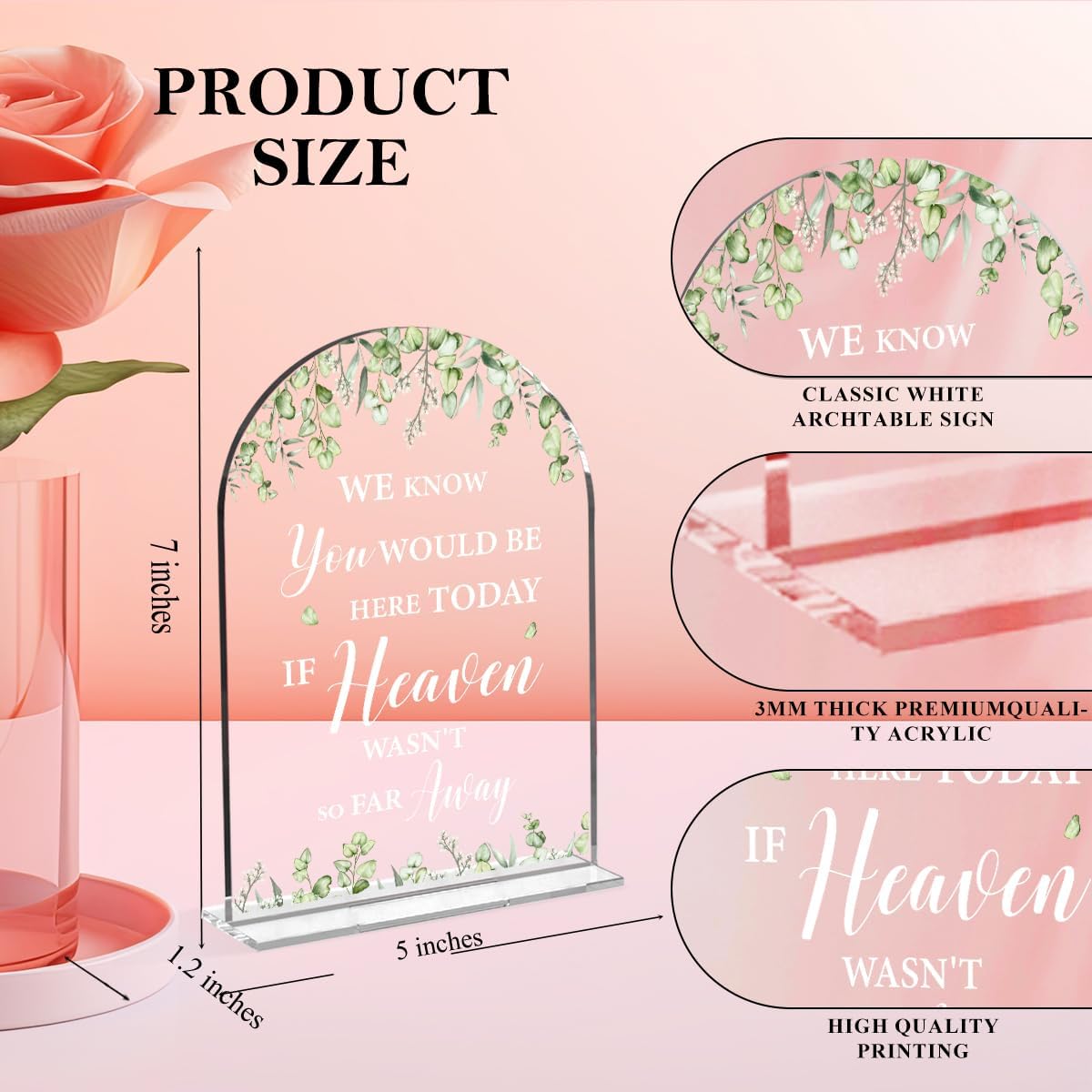 • Package Included: Includes an 5" x 7" white arched acrylic sign with a thickness of 0.12" and comes with an acrylic base measuring 5 x 1.8 inches.