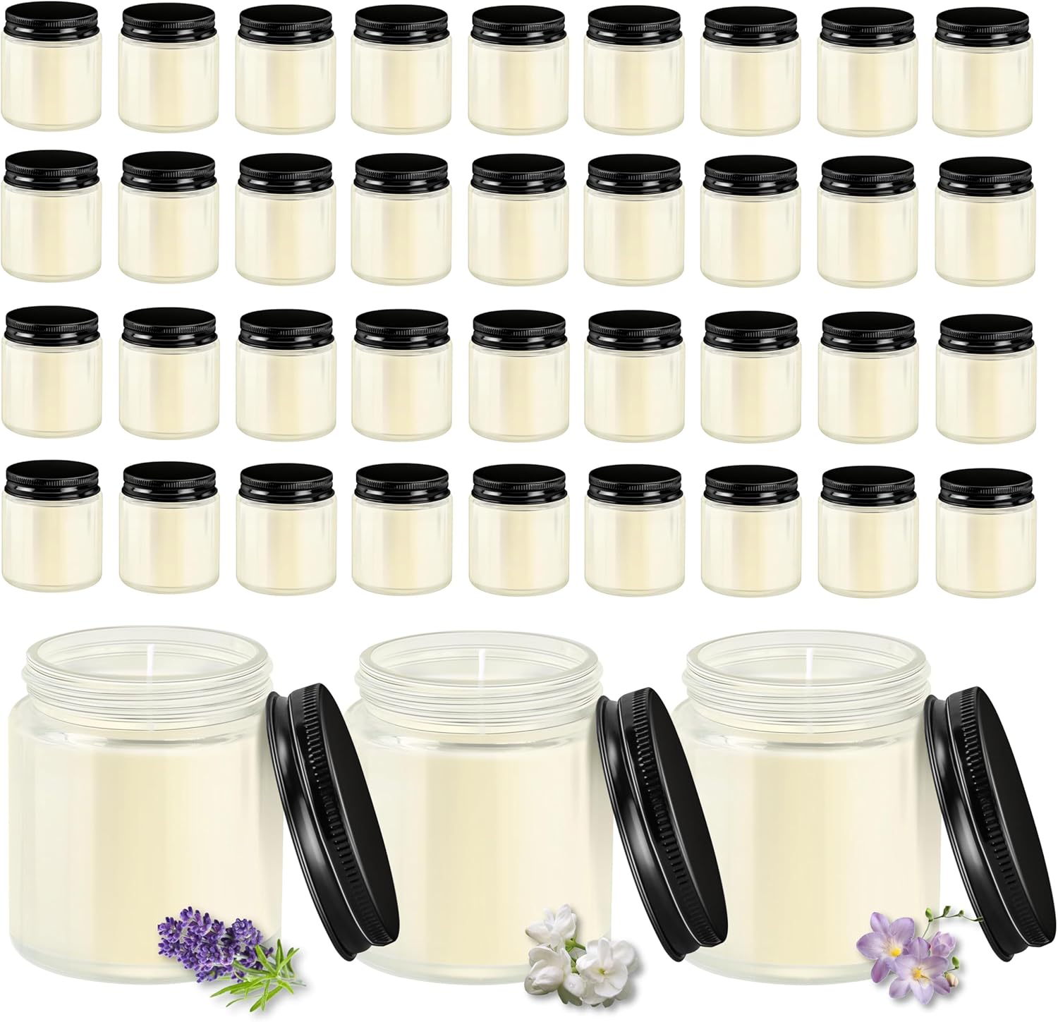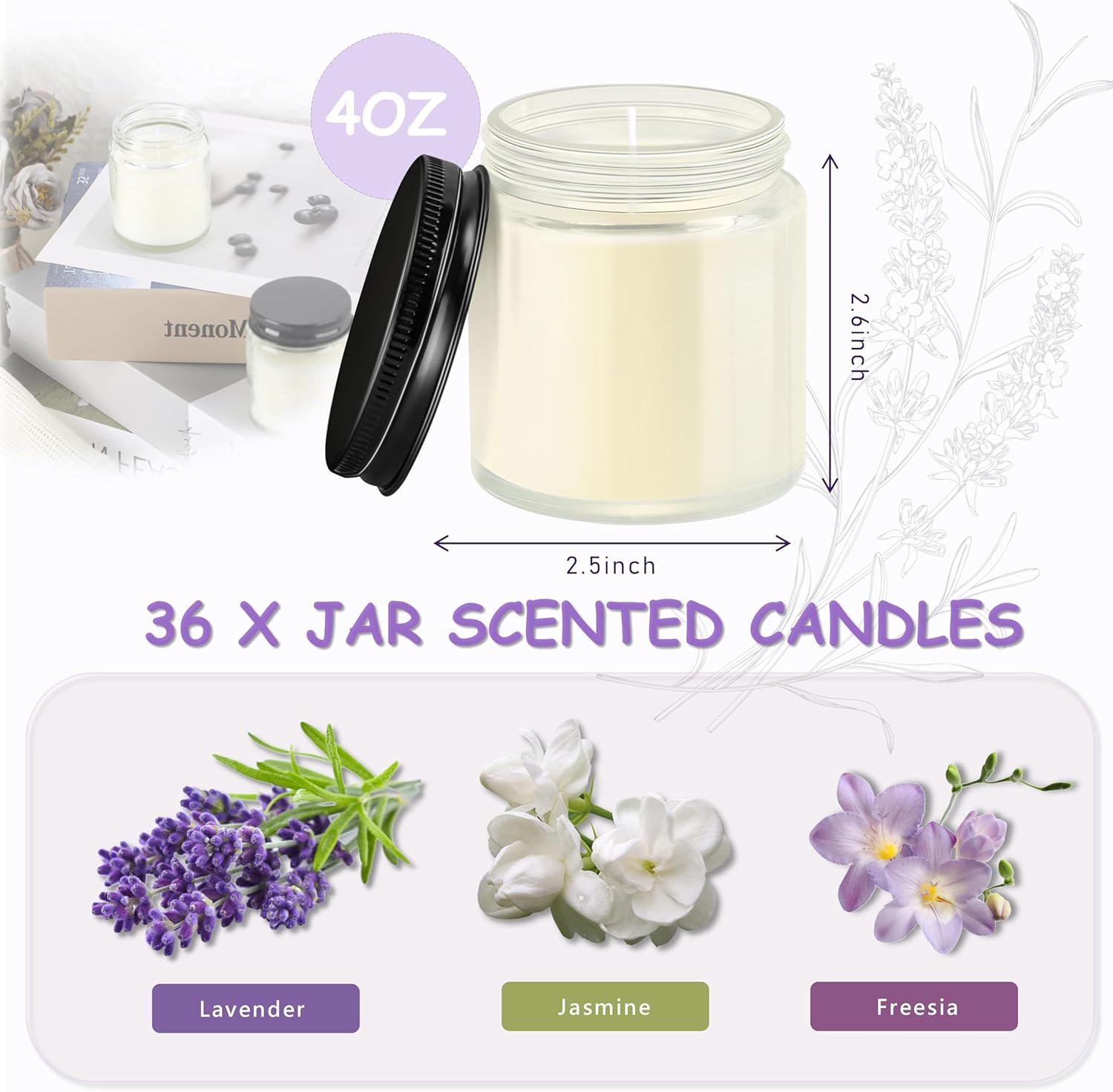 • Product Contents: 36 candles (4 oz each) in glass jars with black lids, including 12 lavender, 12 freesia, and 12 jasmine-scented candles.