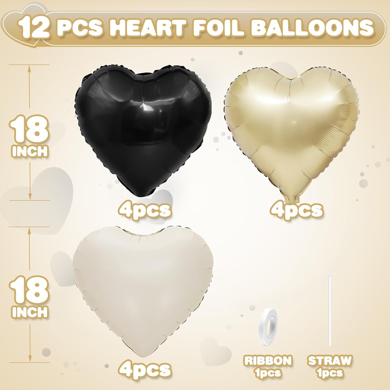 • 【12PCS HEART BALLOONS】Package include 4pcs cream white heart foil balloons,4pcs black heart foil balloons,4pcs light gold heart foil balloons,1pc straw.Large enough to help you better decorate your party.