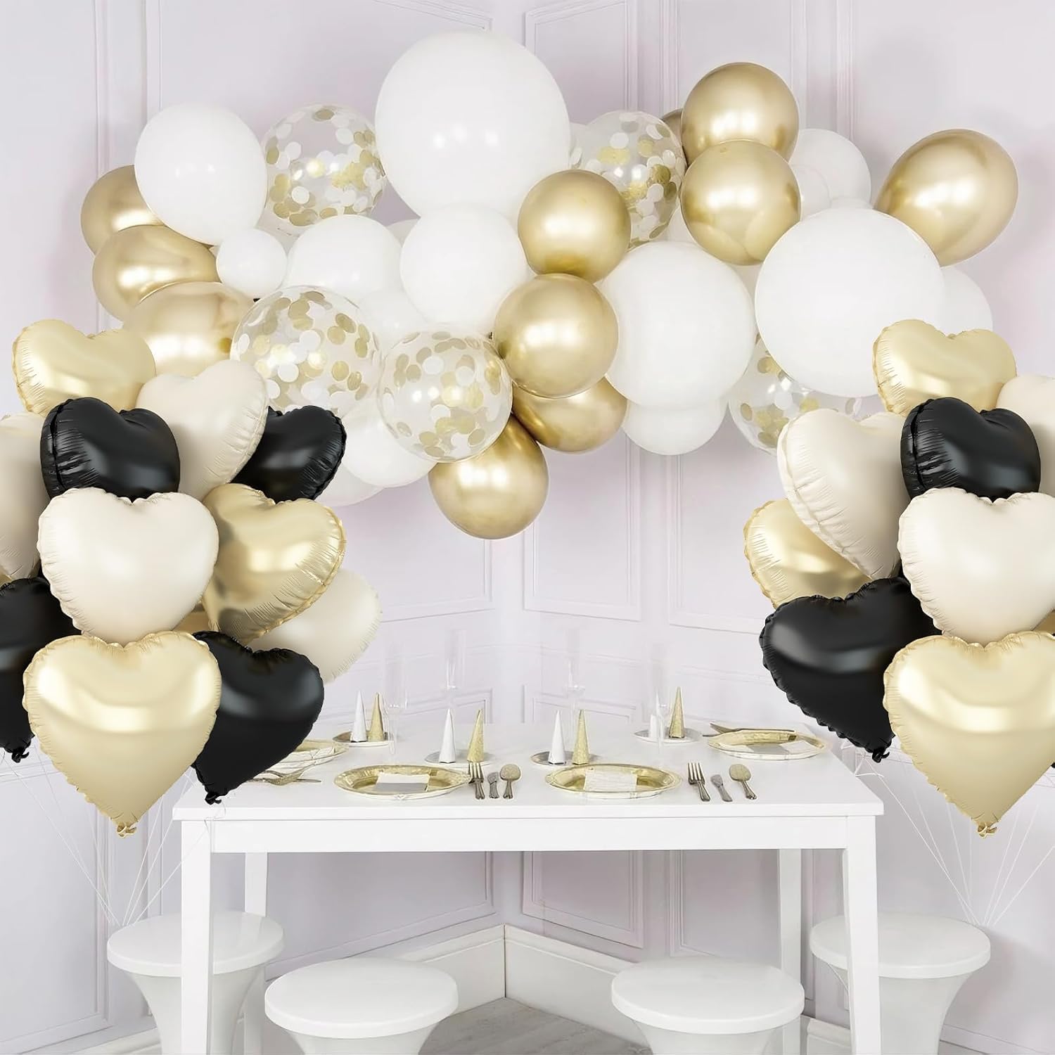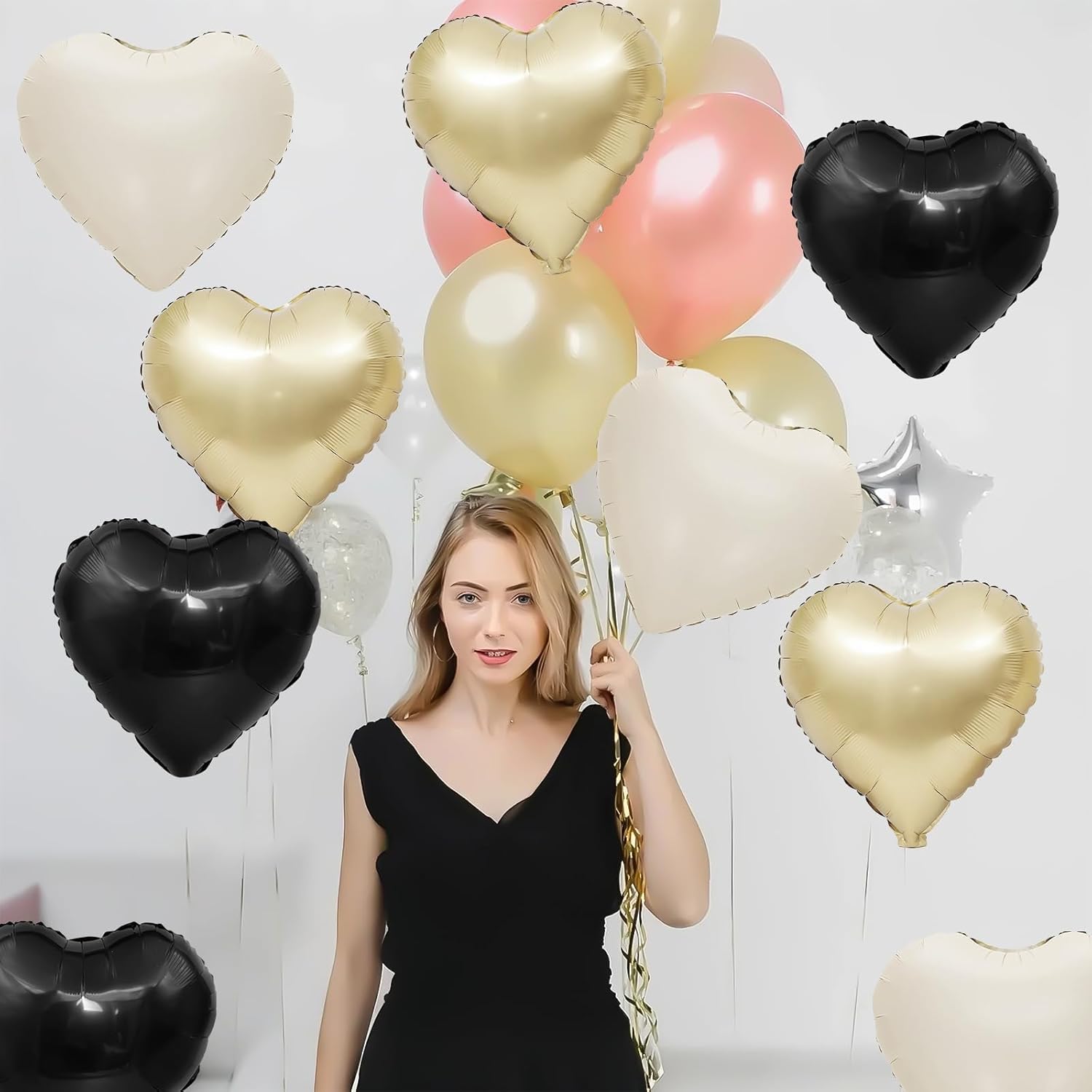 Black White Gold Heart Balloons,12Pcs 18Inch Black Cream White Champagne Gold Heart Shaped Foil Helium Balloons for Baby Shower Birthday Anniversary Wedding Engagement Party Decorations