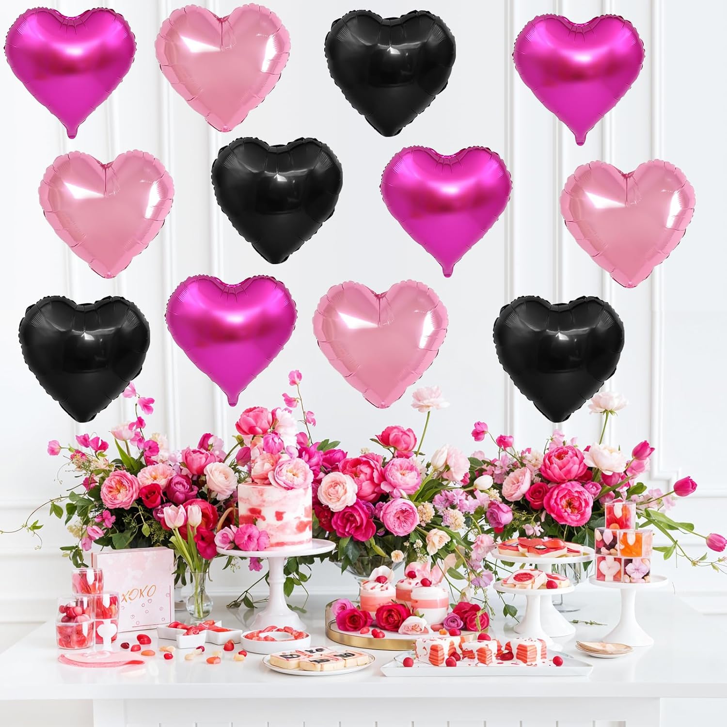 • WIDELY APPLICATION:This pink black heart balloon can be used for a variety of occasions,such as birthday,anniversary,Valentine's Day,Mother's Day,baby shower,gender reveal,weddings,engagement,bridal shower,marriage proposals and other parties,can also be used as a photo background,etc.Make a deep impression on the party guests.