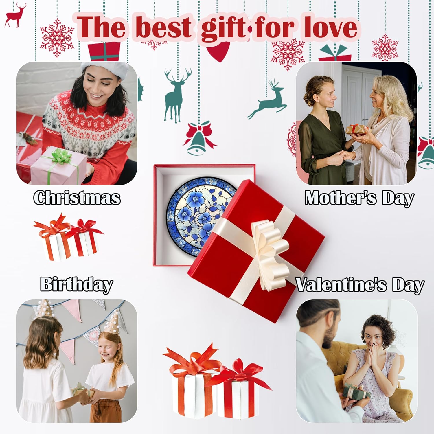 Stained Glass Window Hanging, Blue and White Plum Blossom Sun Catcher for Door Home Decor Flowers Suncatcher Christmas Mother's Day Birthday Gifts for Women Men Mom and Nana 7.8 in