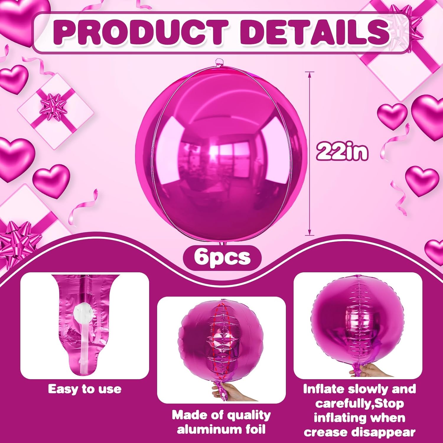 • 【6PCS ROUND BALLOONS】package include 6pcs 22inch Hot Pink round giant 4D foil balloons. The Hot Pink round balloons are large enough to help you better decorate your party.