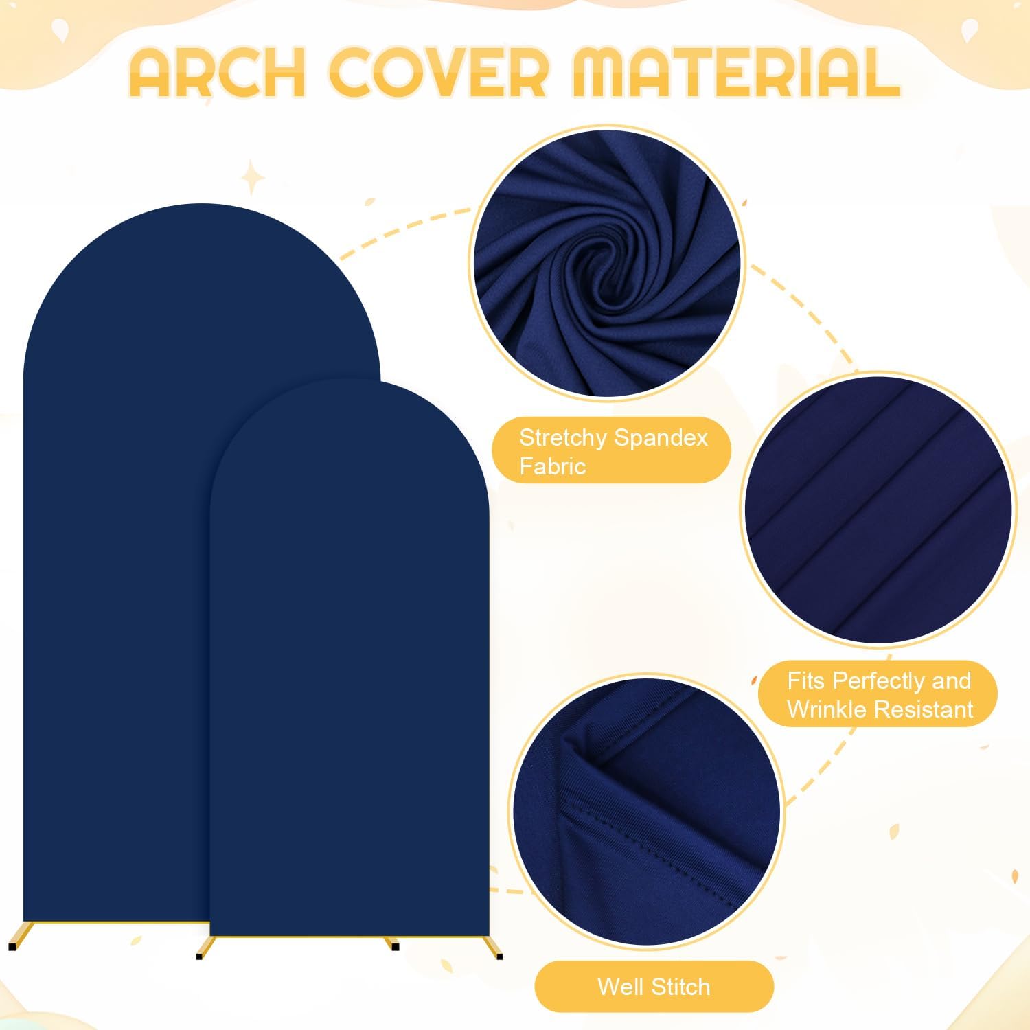 FUHSY Set of 2 Metal Backdrop Stand with Wedding Arch Cover Spandex 7.2FT, 6FT Balloon Party Backdrops Arch Stand Navy Blue Arched Backdrop Cover for Baby Shower Birthday Ceremony Banquet Event Decor