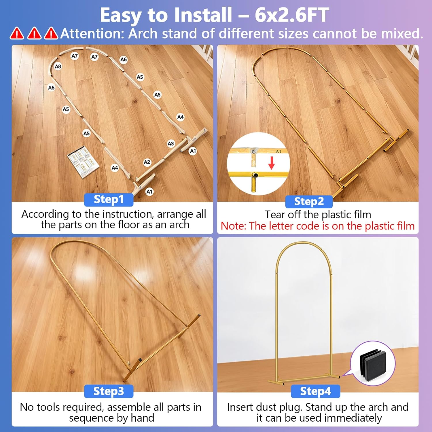 • Complete Ready to Use Kit: Includes all parts of arch stand set (size 6 ft/ 5 ft/ 4 ft), heavy-duty ground stakes (secures outdoor setups on grass or uneven terrain), 4 plastic dust-proof caps (blocks dirt/debris from tube ends), and an illustrated manual