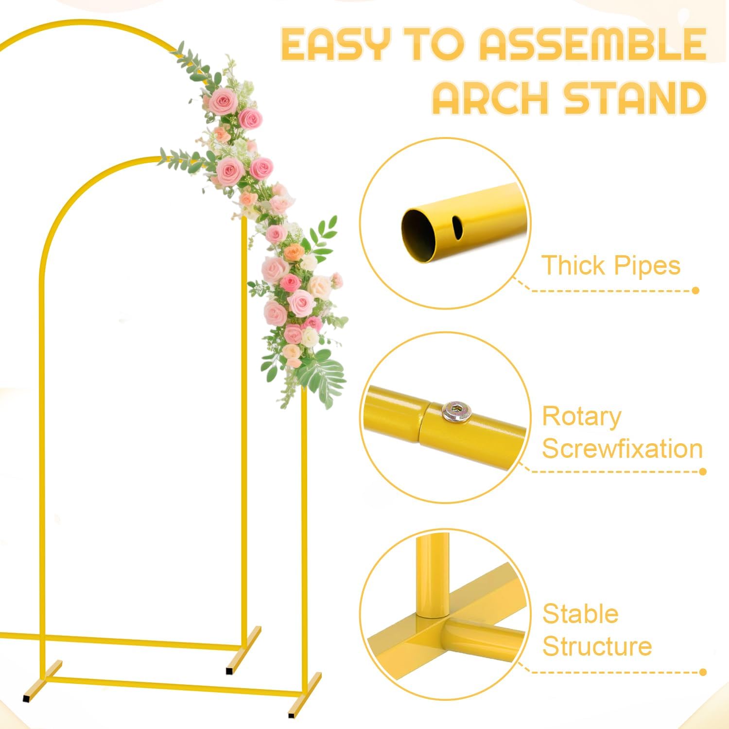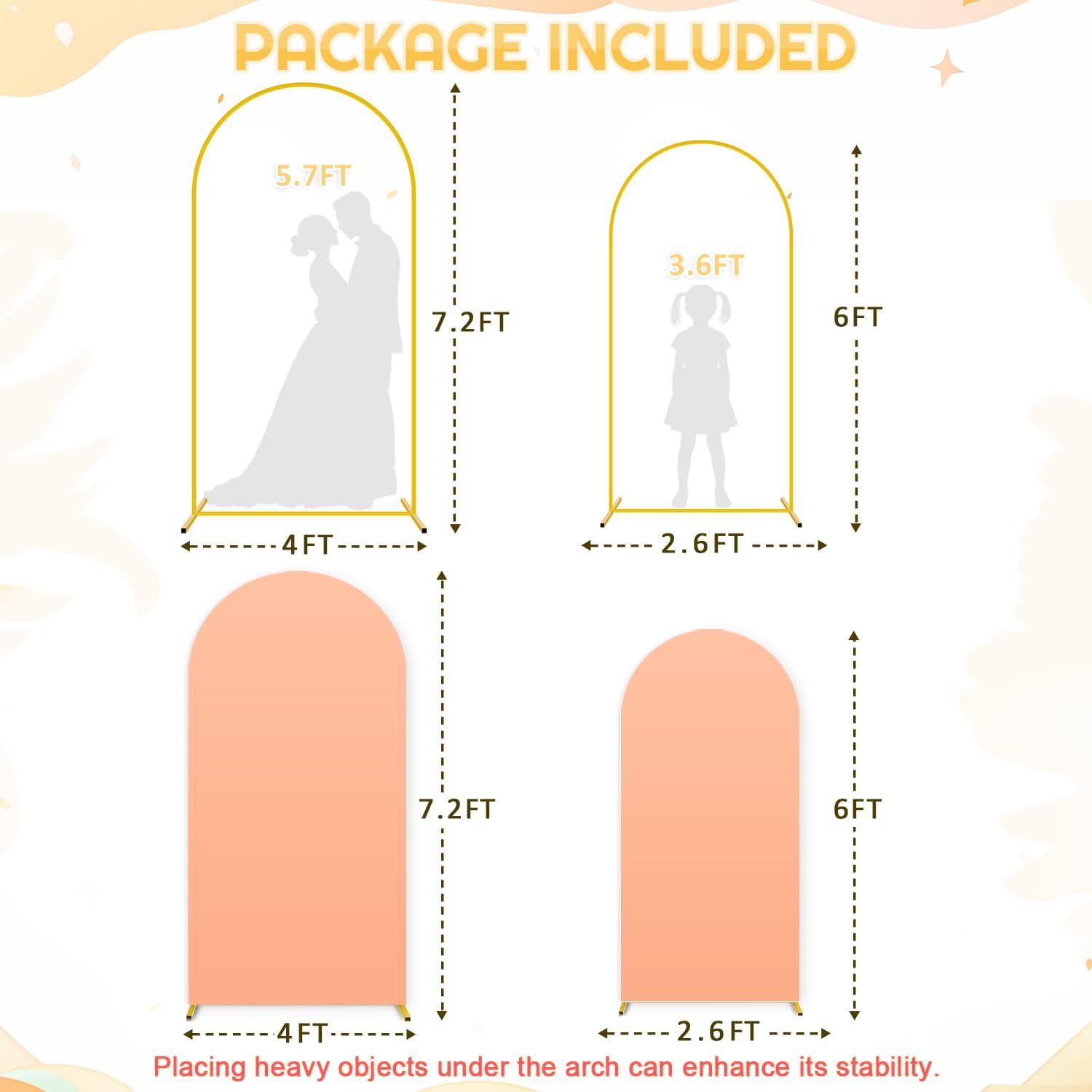 • 🥂【Package Included - Arch Backdrop Stand and Cover】You will receive 2 gold backdrop arch stand and 2 peach arch and cover backdrop set. Size: Size: 7.2ft H x 4ft W, 6ft H x 2.6ft W. Let's create unforgettable moments with our backdrop arch stand with cover!