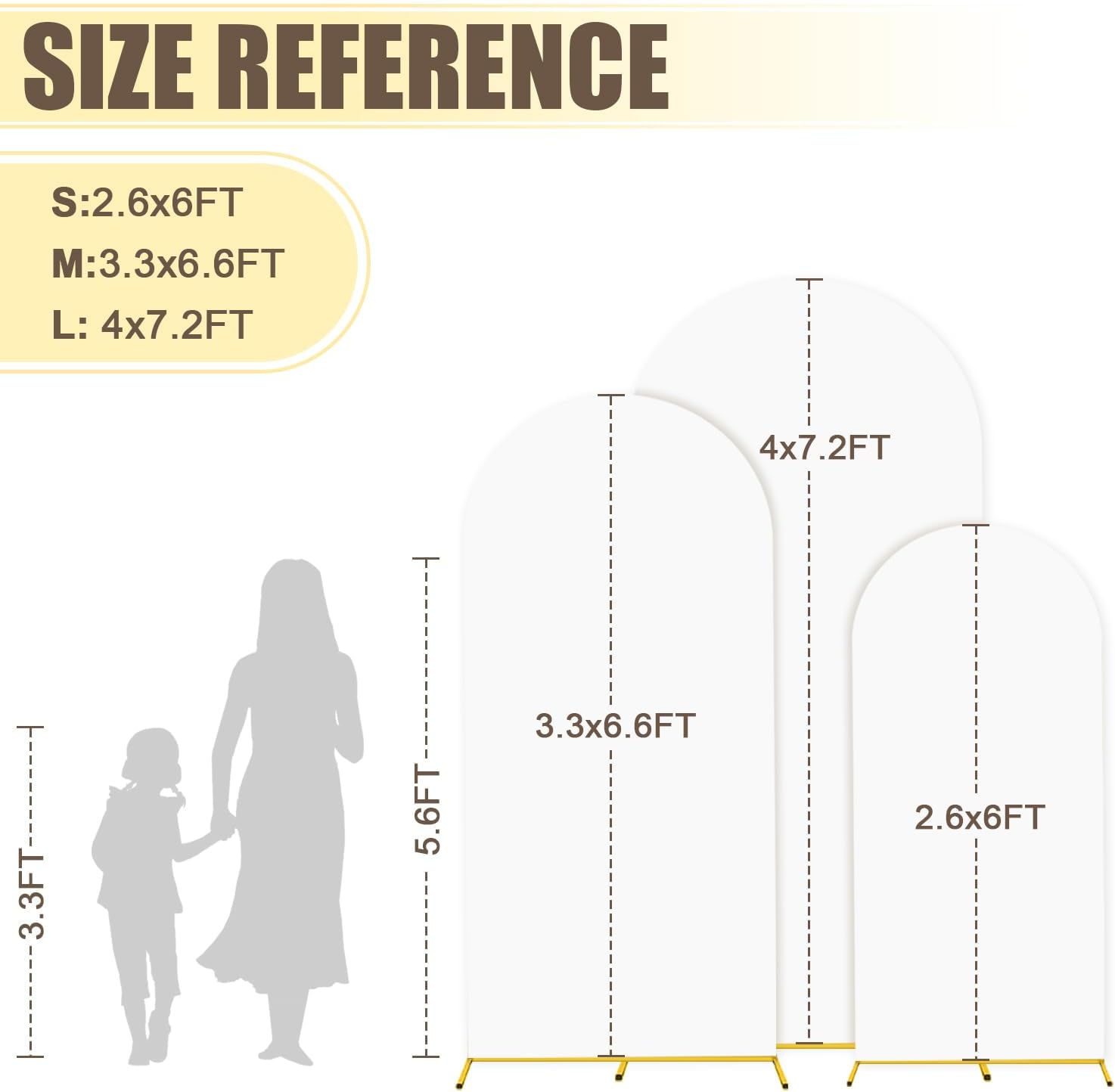 • ⭐Size Guide - Metal Arch Backdrop Stand and Cover: The size of arch backdrop stand set about are 2.6FTx6FT(W x H), 3.3FTx6.6FT(W x H), 4FTx7.2FT(W x H) with white arch cover set. Metal arch backdrop stand set add a graceful and striking look for your party or event.