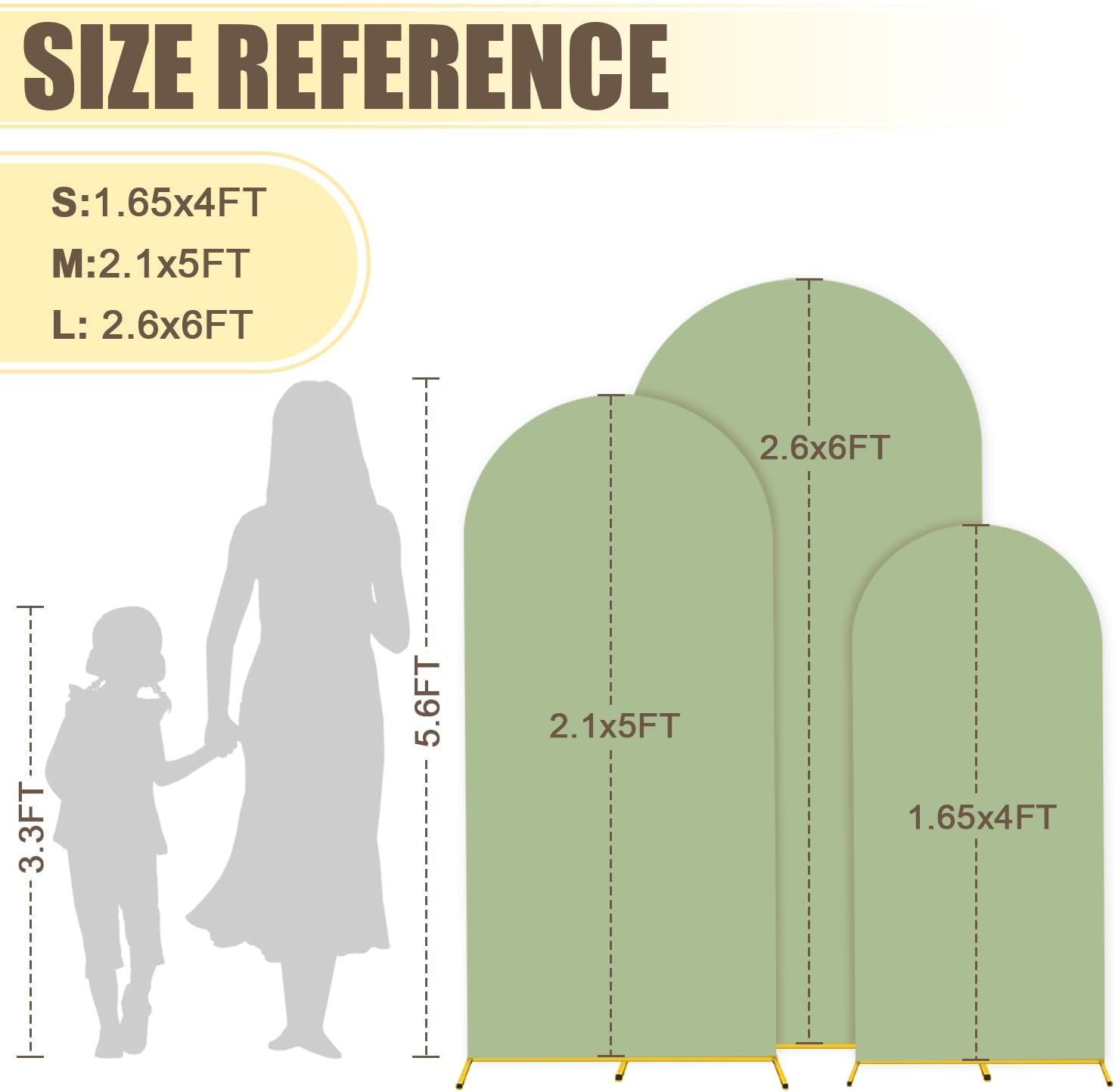 • ⭐Size Guide - Arch Backdrop Stand and Cover Set: The size of arch backdrop stand set about are 1.25FTx4FT(W x H), 2.1FTx5FT(W x H), 2.6FTx6FT(W x H) with sage green arch cover set. Metal arch backdrop stand set add a graceful and striking look for your party or event.