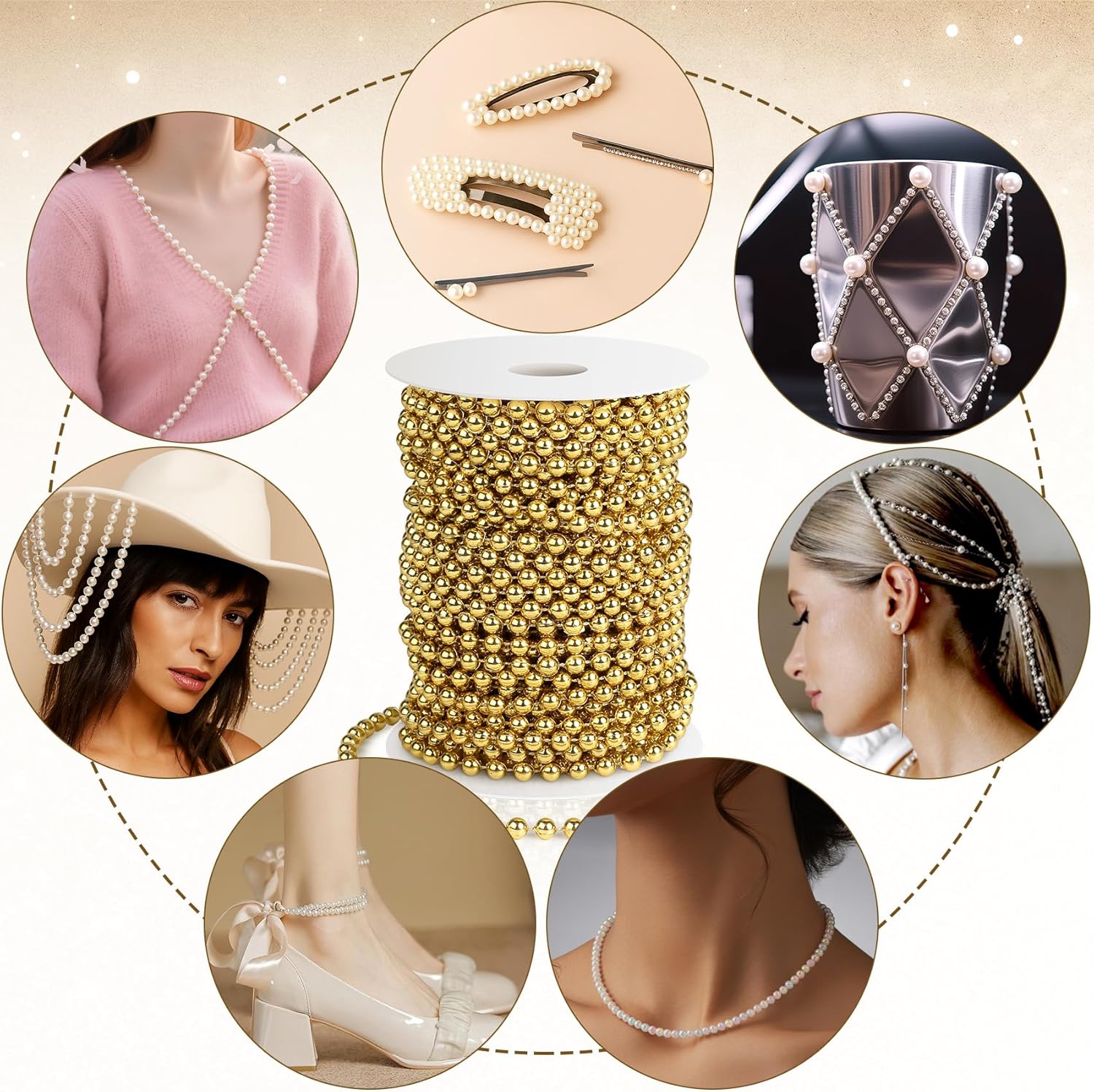 Pearl Beads Garland, 6 MM Gold Faux String of Pearls, Pearl Garland for Christmas Tree 82FT Pearl Beads Strand Spool Bead Roll for Crafts Floral Centerpieces Wedding Party Christmas Tree Decorations