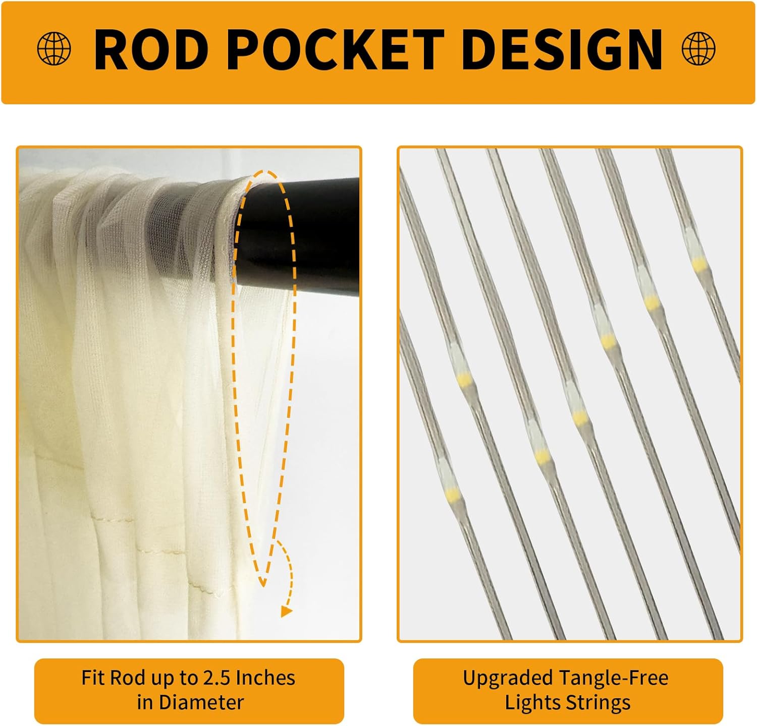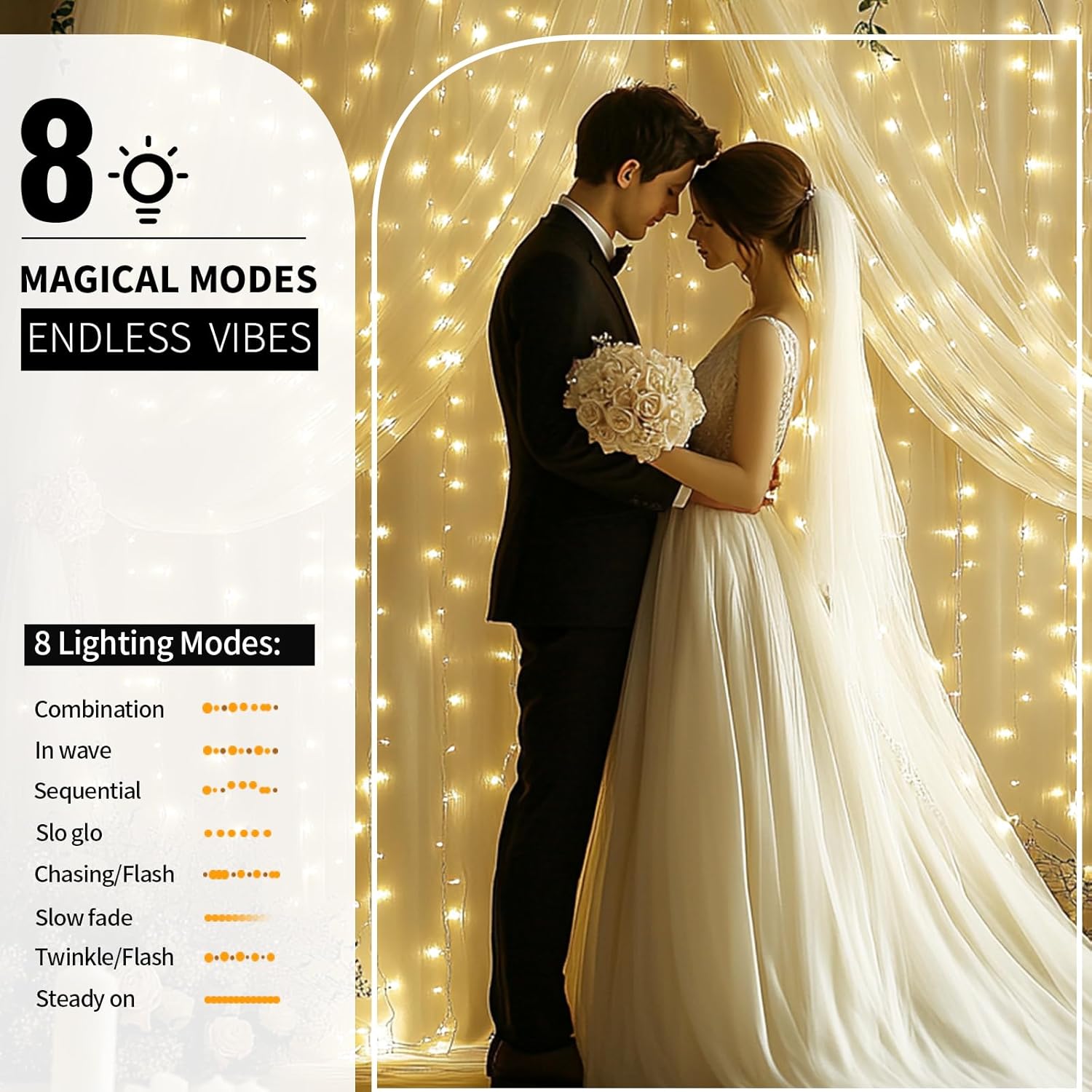 • Quick Setup in 3 Steps: 1. Hang curtains via rod pocket on any pipe/stand. 2. Attach lights using included clips before untying strands. 3. Plug USB into power bank/wall outlet – instant warm glow and choose from 8 lighting modes to create a romantic and magical atmosphere for any occasion! Tangle-free design saves 70% setup time