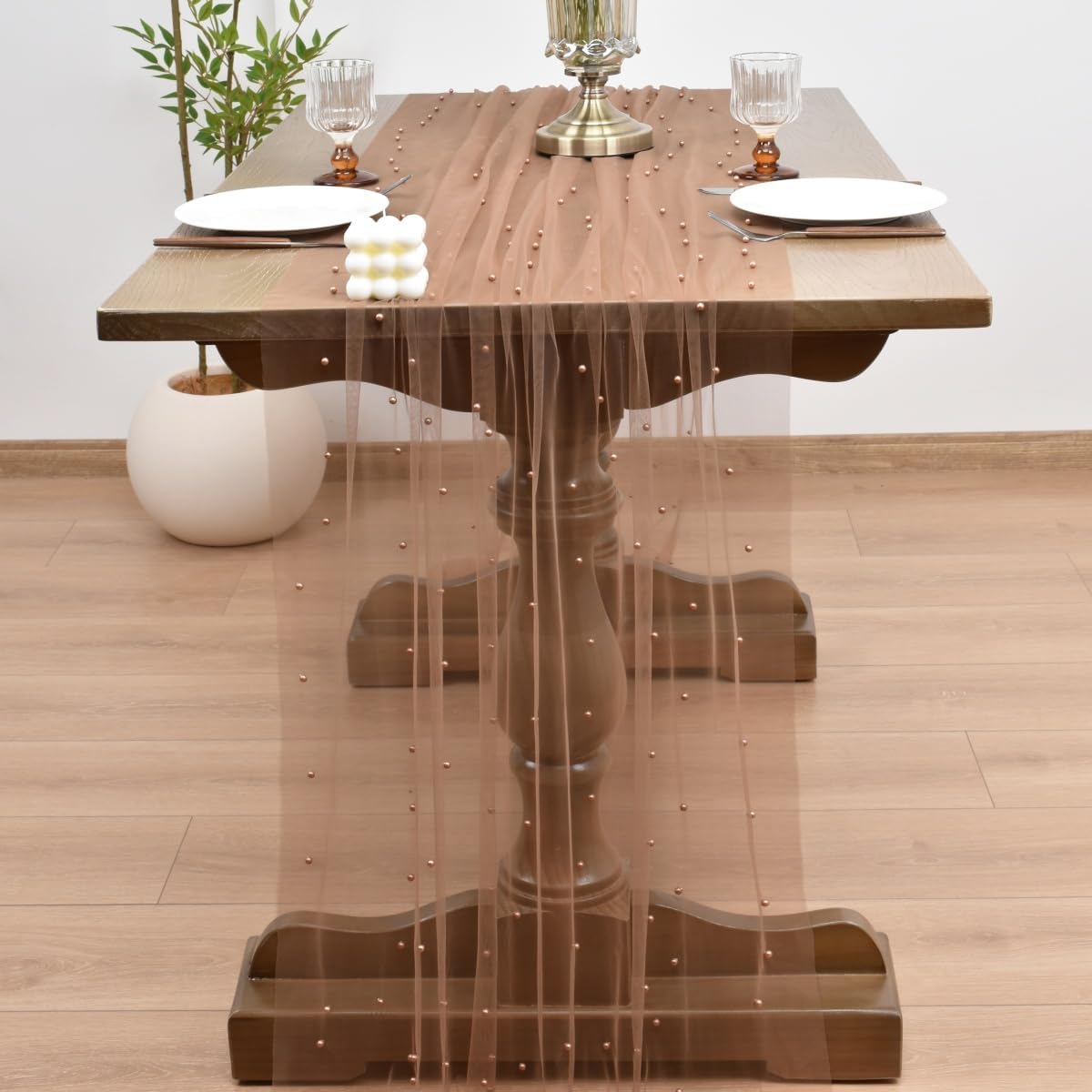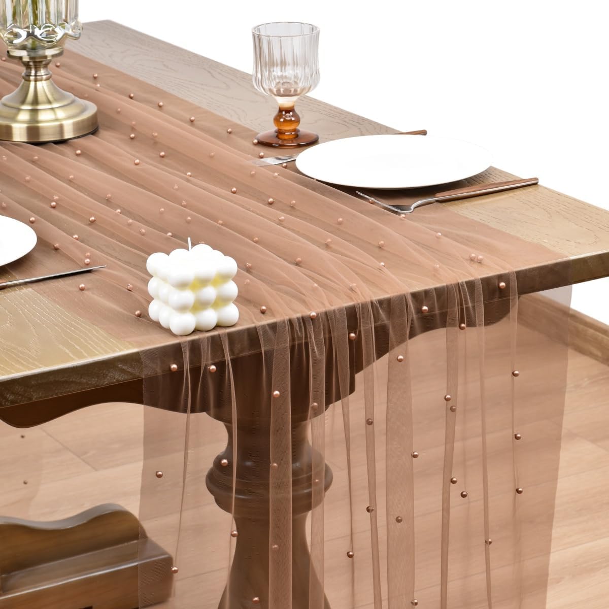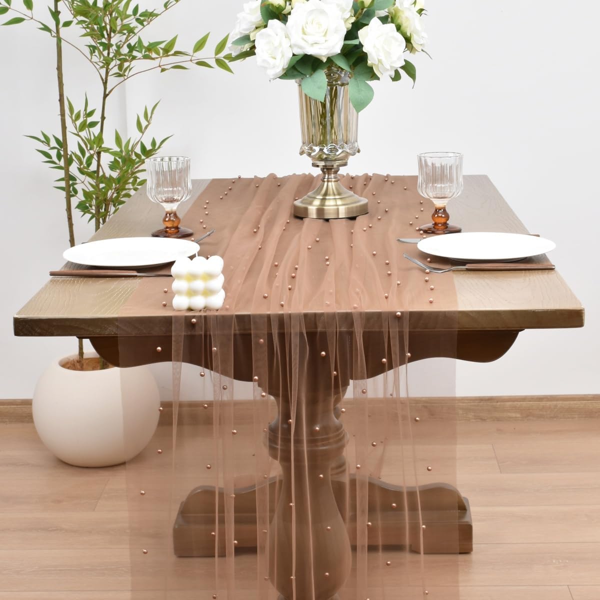 Joanlody Fall Pearl Table Runner 10ft Rustic Boho Tulle Table Runner with Pearls for Baby Shower Wedding Party Veil Dessert Thanksgiving Table Decor Coffee