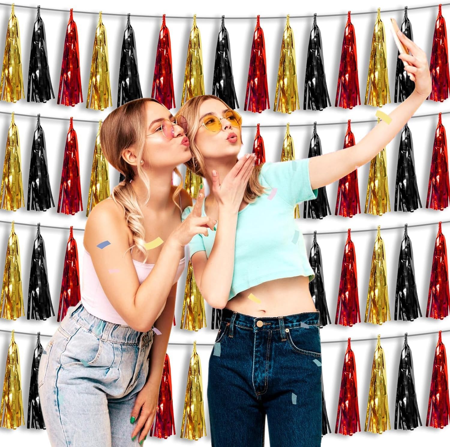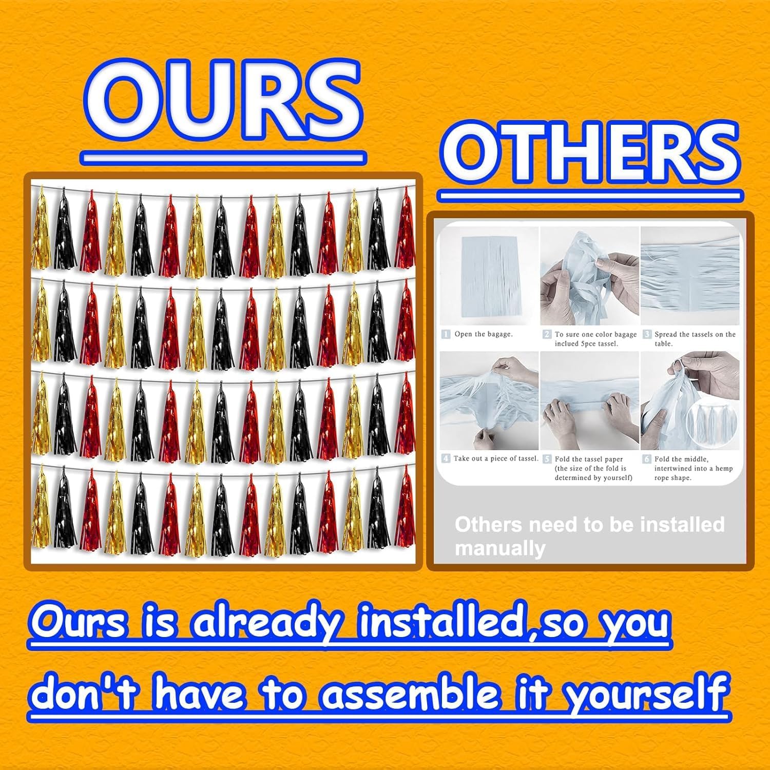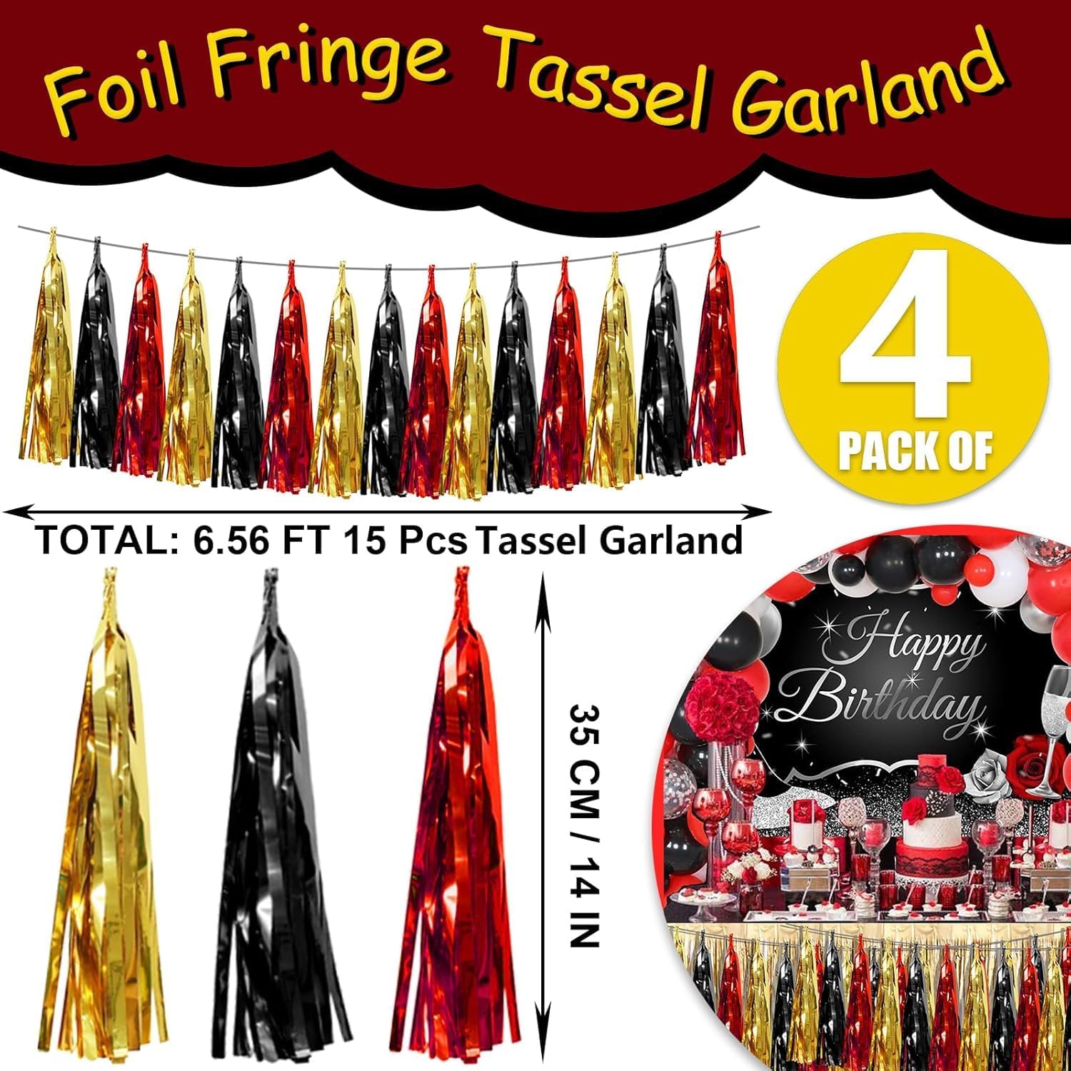 • 【Package Includes】The total length of the red black gold birthday tassels banner is 40 feet, divided into 4 strips, each 10 feet long. Each banner contains 15 tassels, and each tassel measures 14 inches, for birthday decorations many occasions uitable for Patriotic display, omecoming Float, Christmas Float, ecorative metal trailers, graduation floats etc