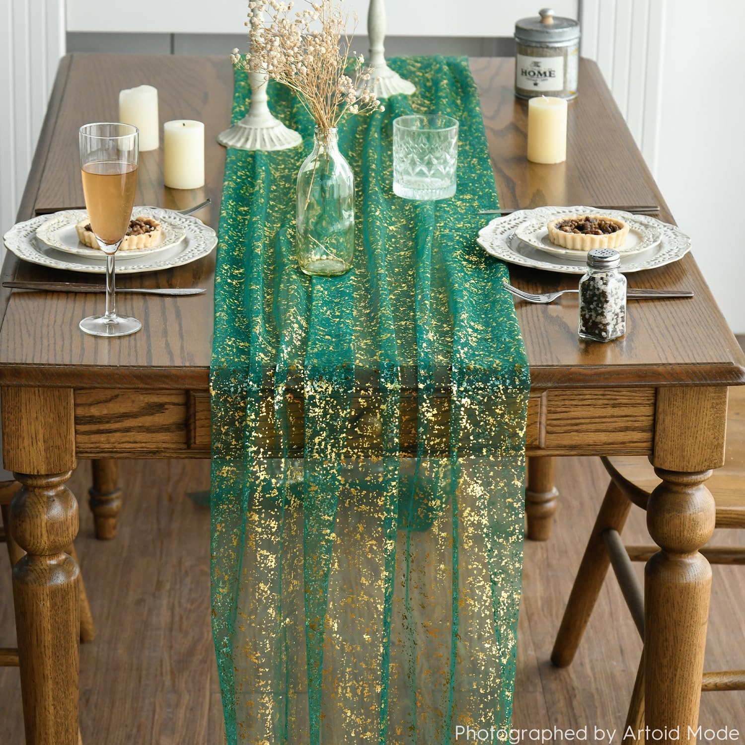 Artoid Mode 6PCS Green Gold Gauze Table Runner 120 Inch 10FT, Glitter Metallic Foil Sheer Dining Wedding Anniversary Holiday Table Decor for Home Party
