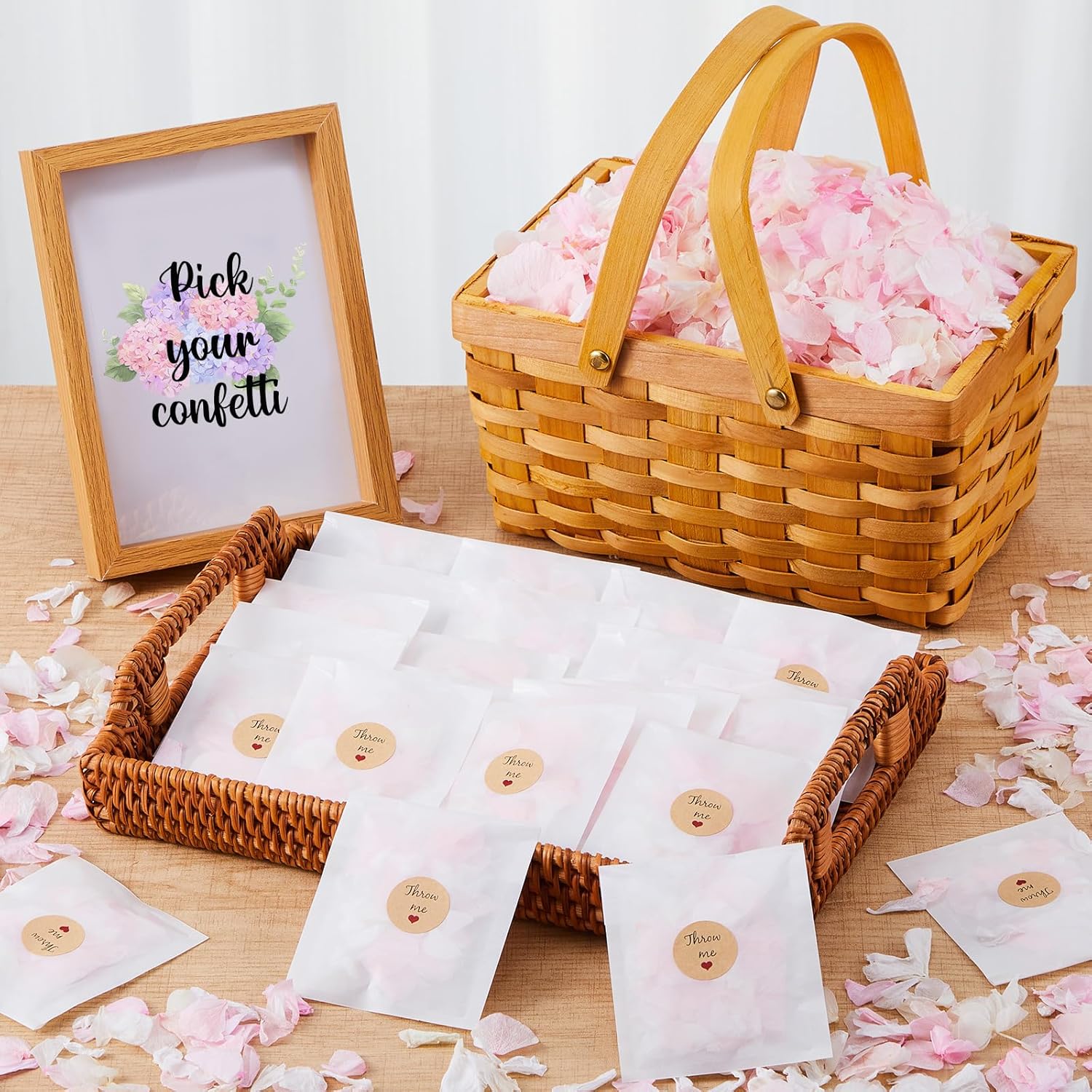 • Wedding Dried Flower Petals: Wedding decorations kits have 80g flower petal cones, 60 pcs throw me sticker, 55 pcs biodegradable packaging bags, they look lifelike and can be preserved like dried flowers which meet your wedding needs, and leave a beautiful memory