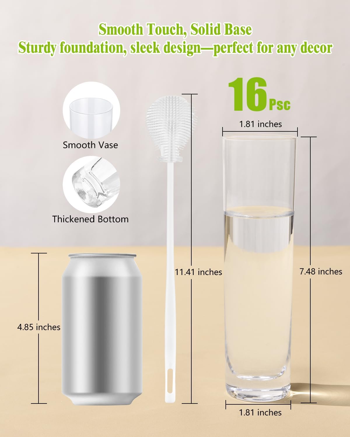 • Glass Cylinder Vases: This set includes 16 high-quality vases for centerpieces. Standing at 7.48 inches tall, with a 1.81-inch mouth and 1.81-inch base, these clear vases offer a minimalist, timeless design perfect for any occasion, with 1 cleaning brush included