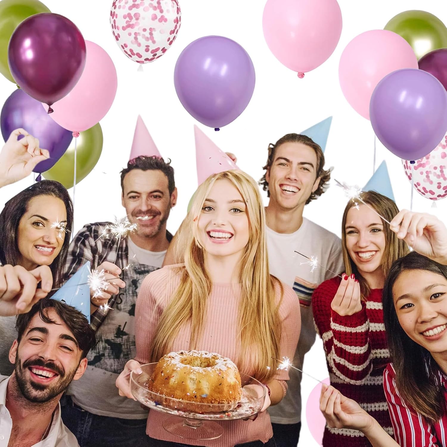 • 6 COLORS LATEX BALLOON: Metallic purple, metallic pink, pink, purple, green, confetti balloon assorted colors;