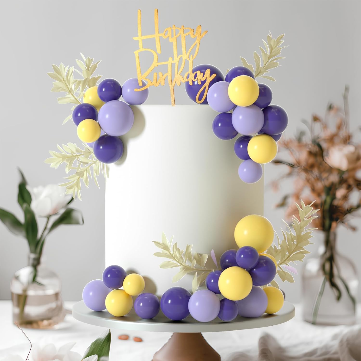 • Package included : 10pcs white grass cake toppers, 1pc happy birthday cake topper,14pcs Purple balls,14pcs yellow balls,14pcs light purple balls