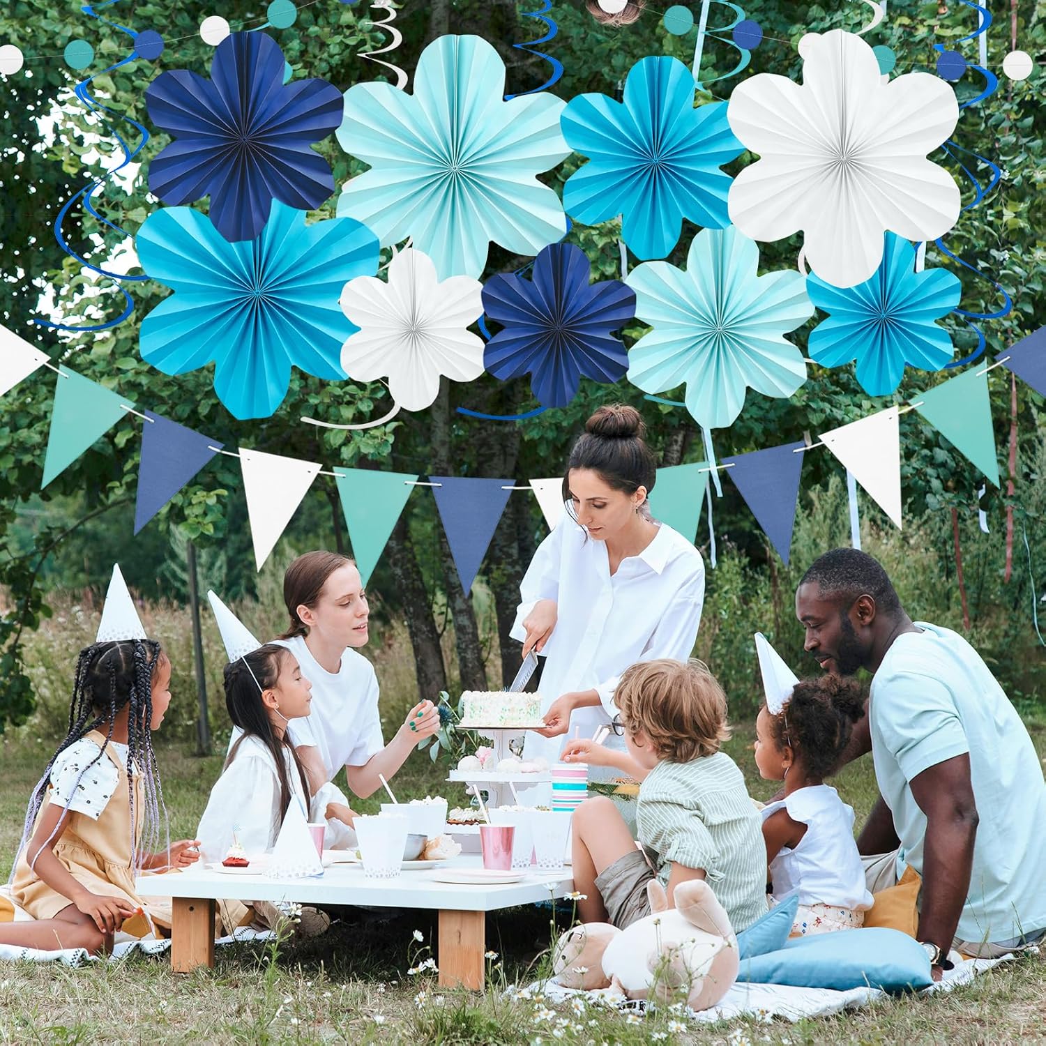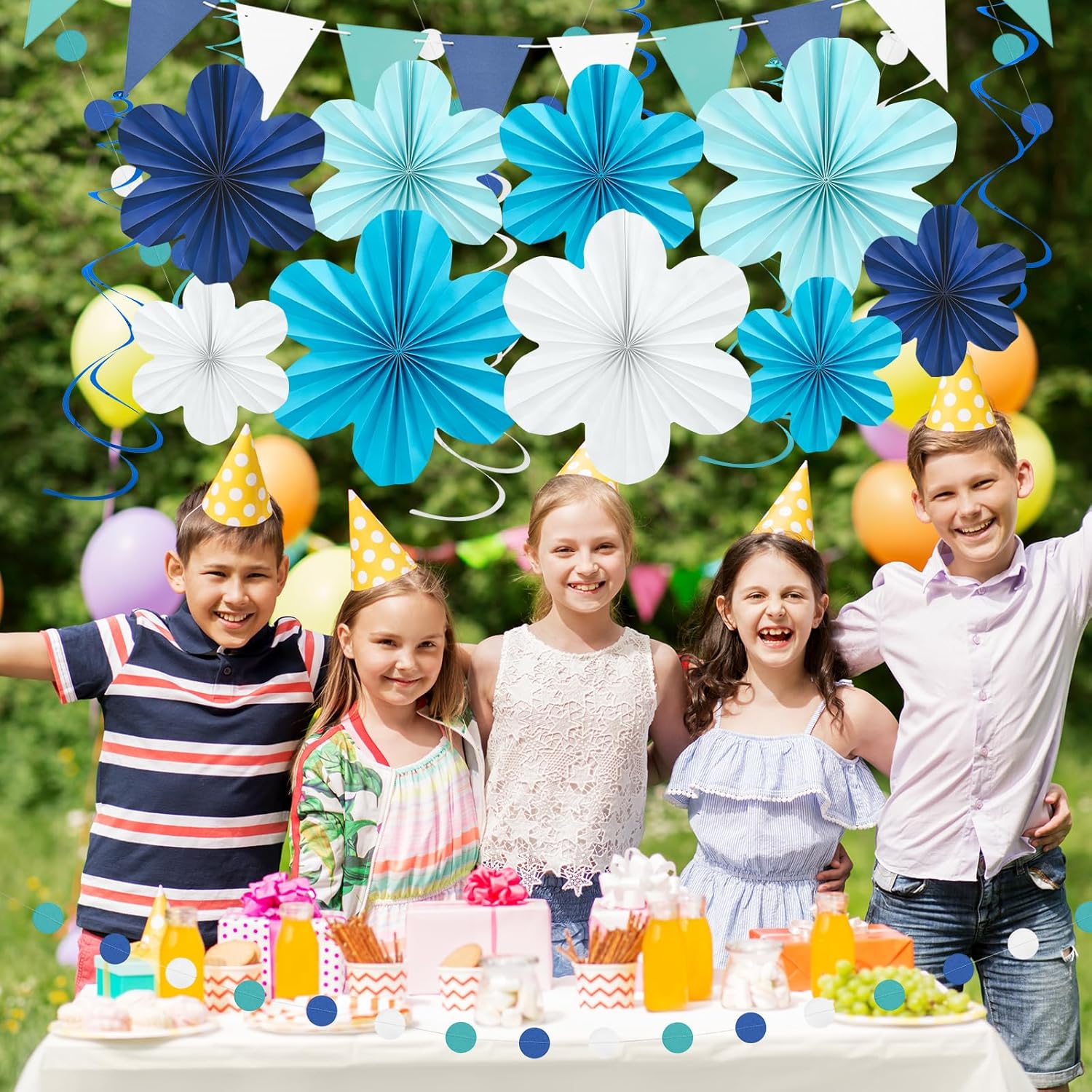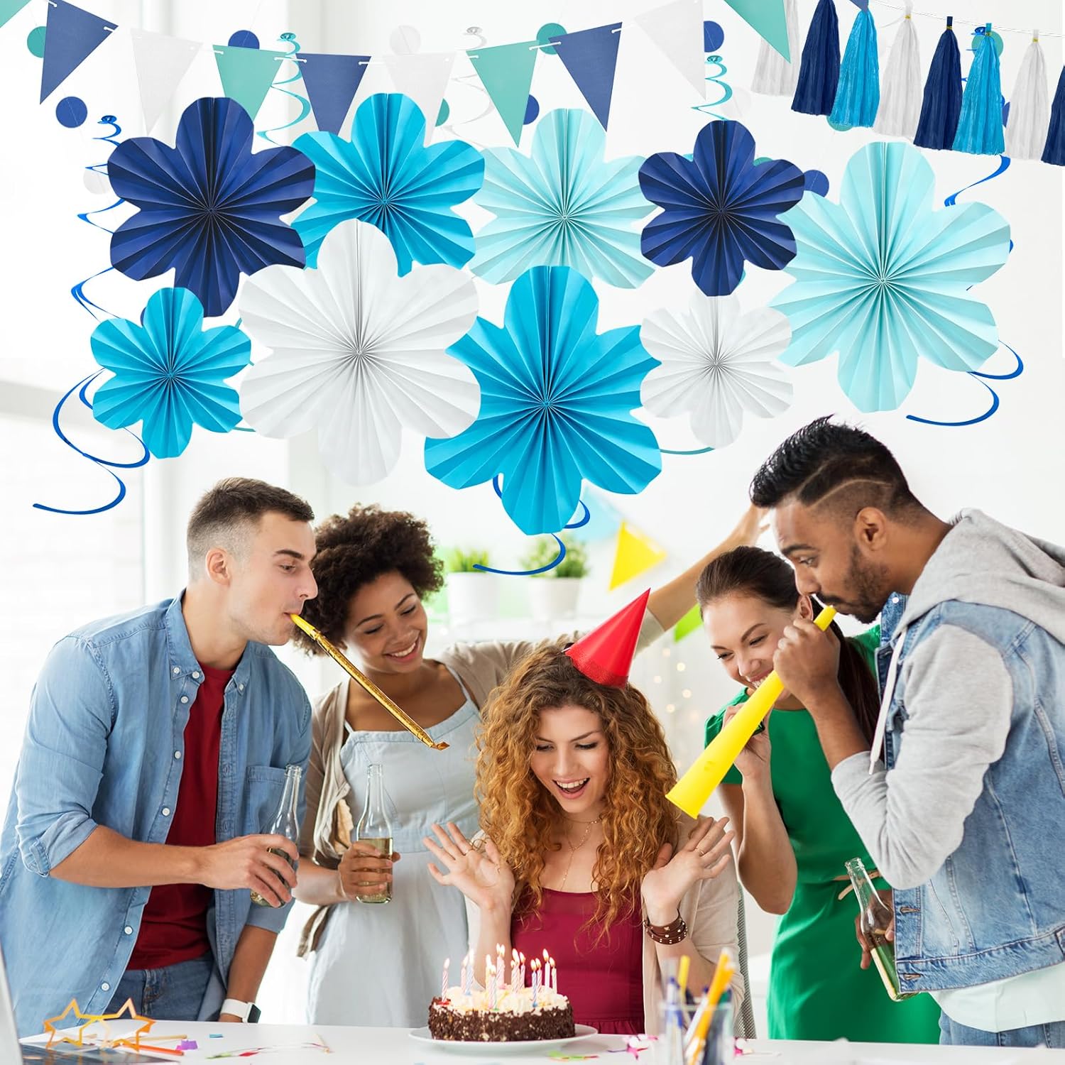 • Blue Party Decorations: Our navy blue paper fans decorations kit includes 3 pcs 12’’ paper flowers, 3 pcs 10’’ paper flowers, 3 pcs 8’’ paper flowers, 9 pcs hanging swirls, 1 pcs 6.56ft tasseled garland, 1 pcs 6.56ft triangular pennants, 2 pcs circle dot garland, 2 pcs ribbon.
