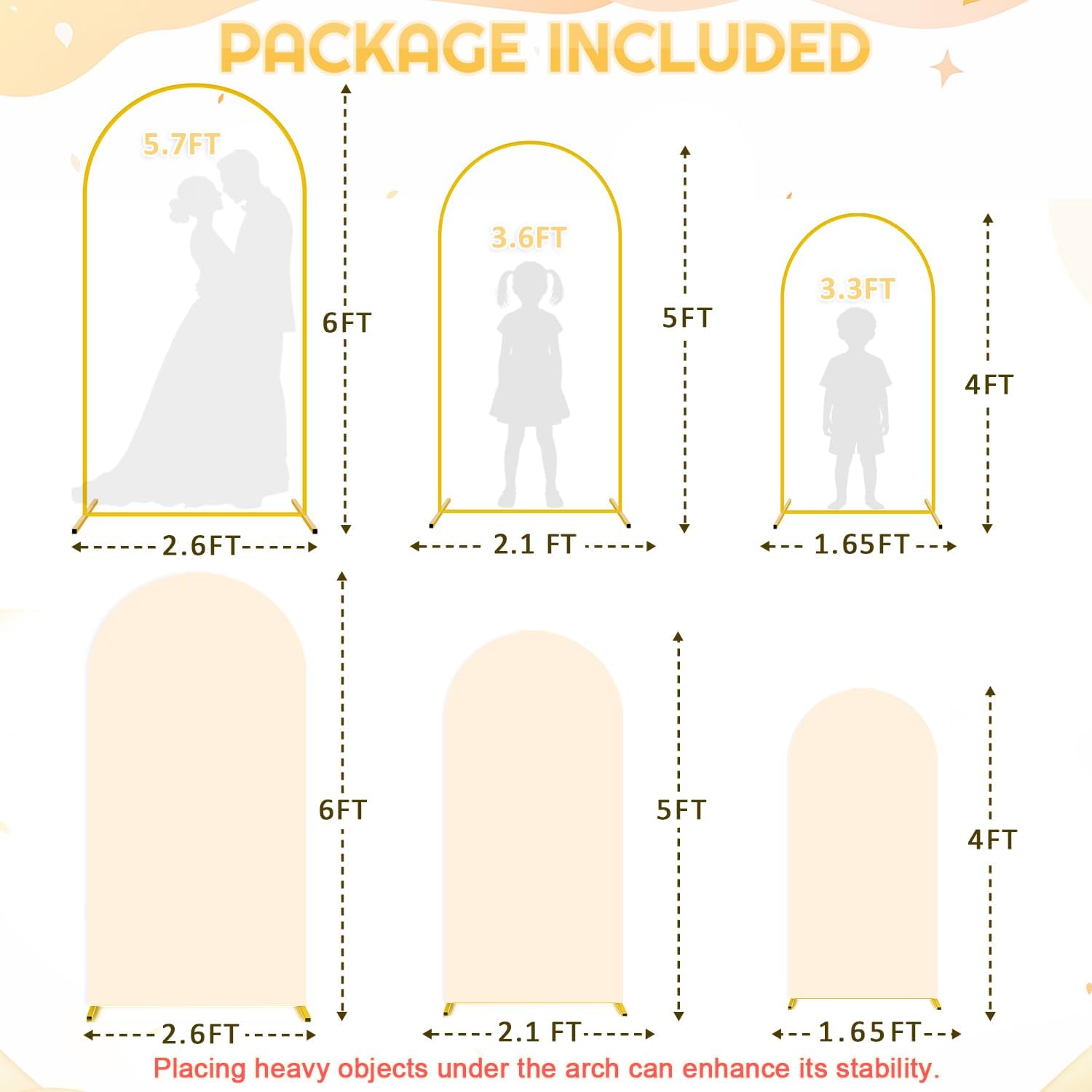 • đŸ„‚ă€Package Included - Metal Arch Backdrop Stand and Cover Set】You will receive 3 gold metal arch backdrop stand and 3 beige arch cover. Size: Size: 6ft H x 2.6ft W, 5ft H x 2.1ft W, 4ft H x 1.65ft W. Let's create unforgettable moments with our arch backdrop stand cover!