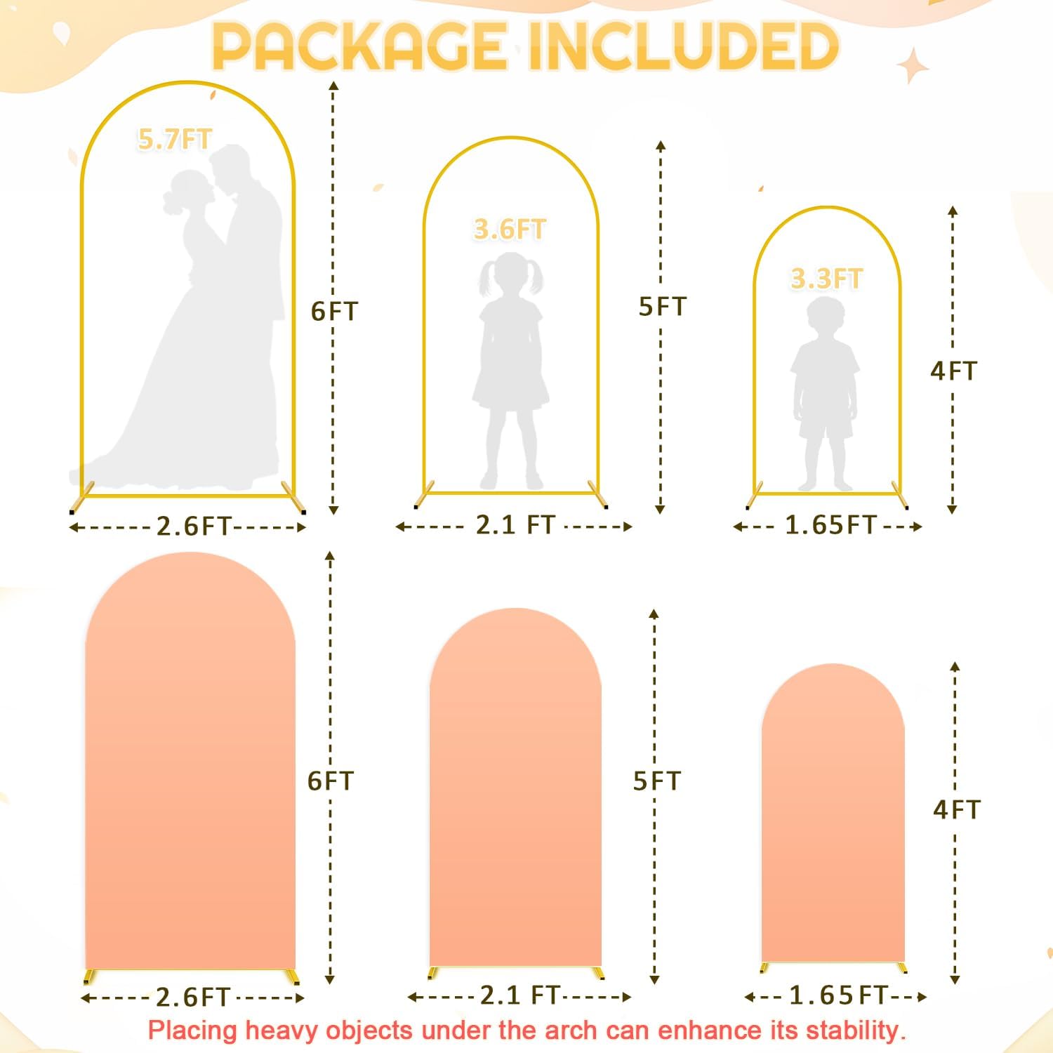 • đŸ„‚ă€Package Included - Metal Arch Backdrop Stand】You will receive 3 gold metal arch backdrop stand and 3 peach arch cover. Size: Size: 6ft H x 2.6ft W, 5ft H x 2.1ft W, 4ft H x 1.65ft W. Let's create unforgettable moments with our arch backdrop stand cover!