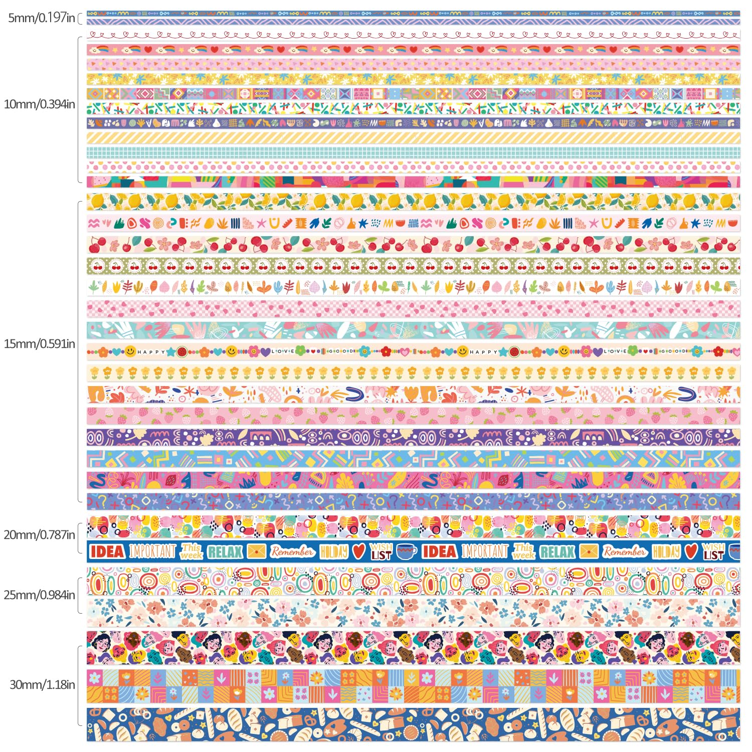 • 35 Rolls Washi Tape,1.18 inch (30mm) wide x 3 tapes; 0.98 inch (25mm) wide x 2 tape; 0.79 inch (20mm) wide x 2 tape; 0.59 inch (15mm) wide x 15 tapes; 0.39 inch (10mm) wide x 11 tapes; 0.19 inch (5mm) wide x2 tapes. These different series and sufficient quantity washi paper stickers can meet your use and replacement.