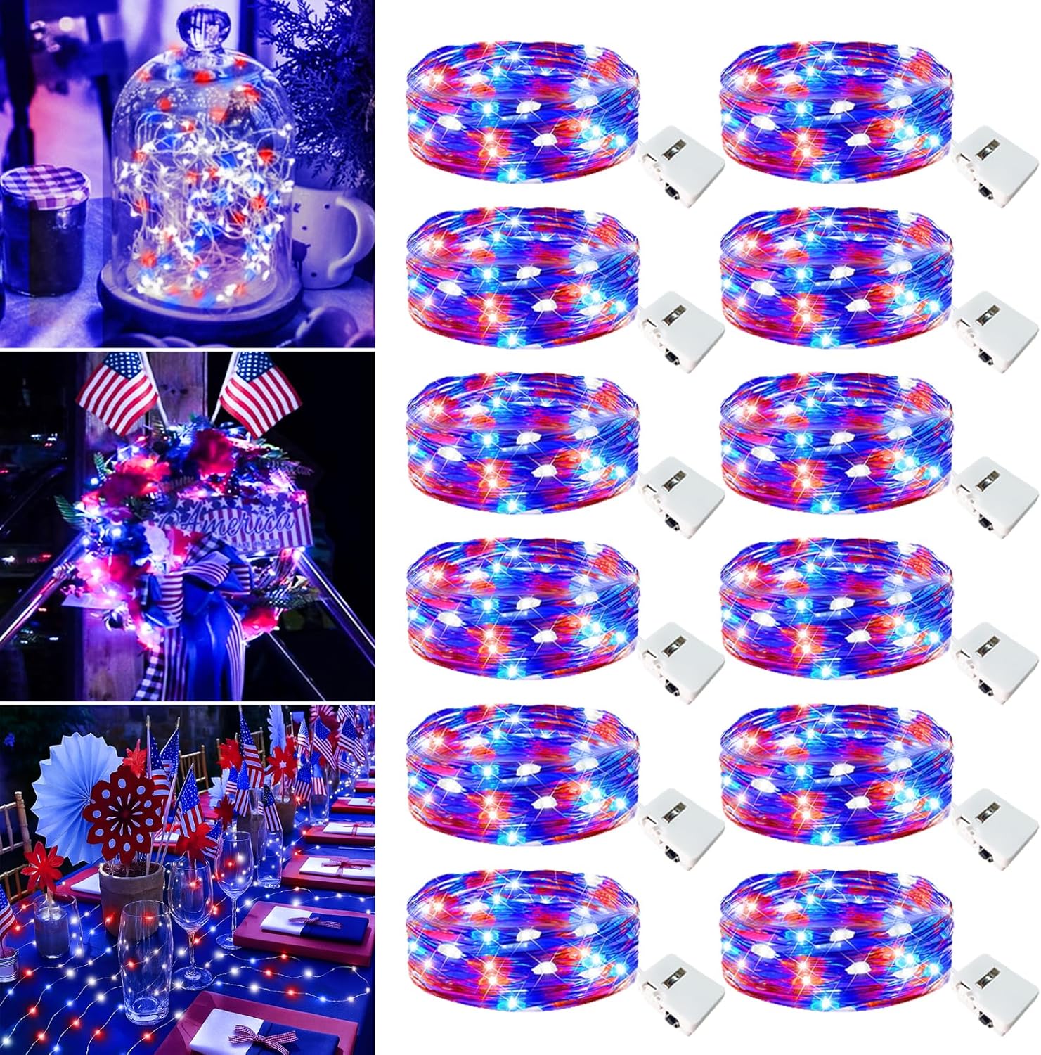 4th of July Decorations - 12 Pack Red White Blue Fairy Lights Battery Operated, 7ft 20 Led Twinkle Lights 3 Modes, Waterproof Bulk Mini String Light for Independence Day Patriotism Decorations