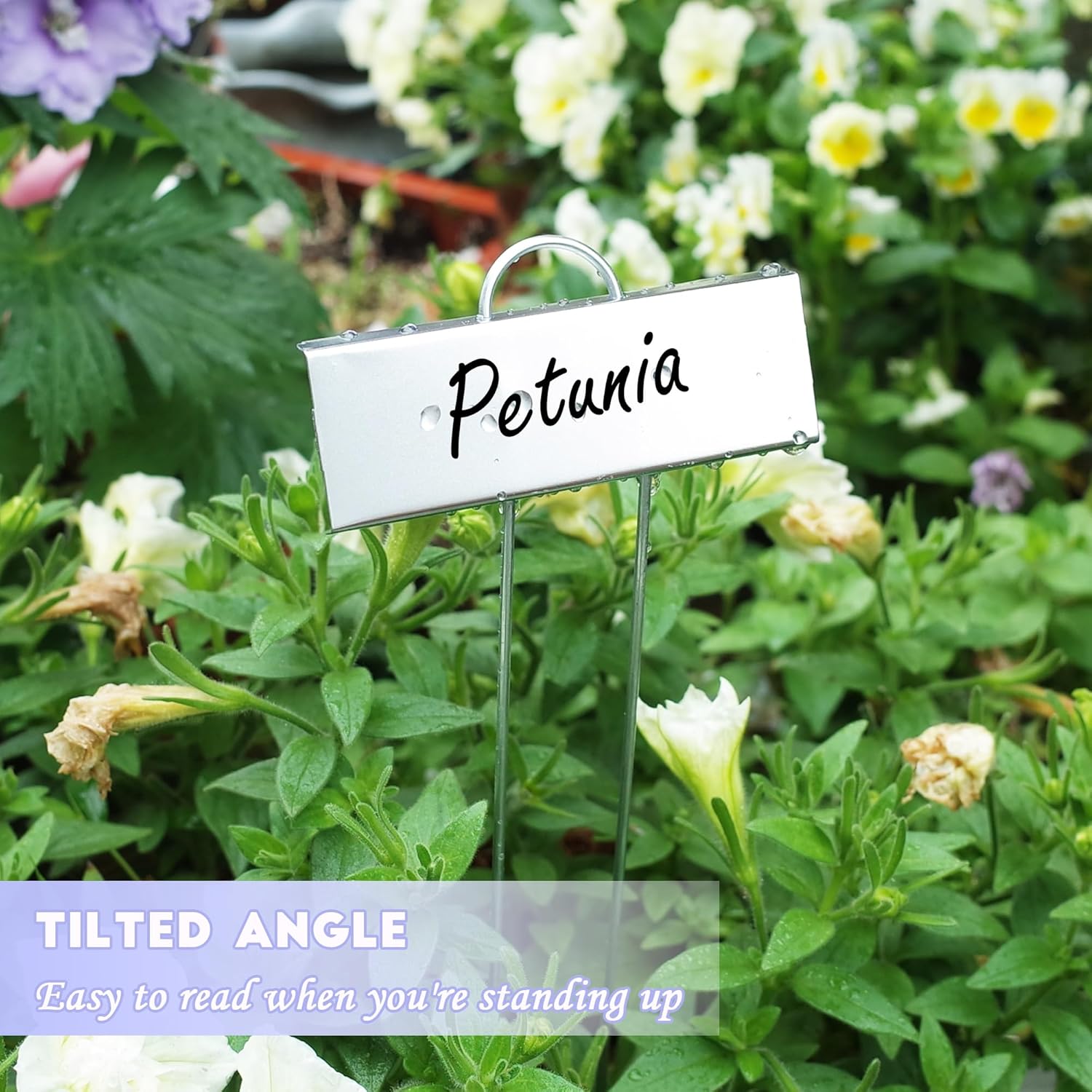 • ♥ Stable Two-Foot & Tilted Angle: The stable 2-foot design of the plant label stakes are simple to insert into the soil and will stay put for years to come. The slightly sloping angle makes it easy to read when you're standing up, it really helps to remind you what's the where.