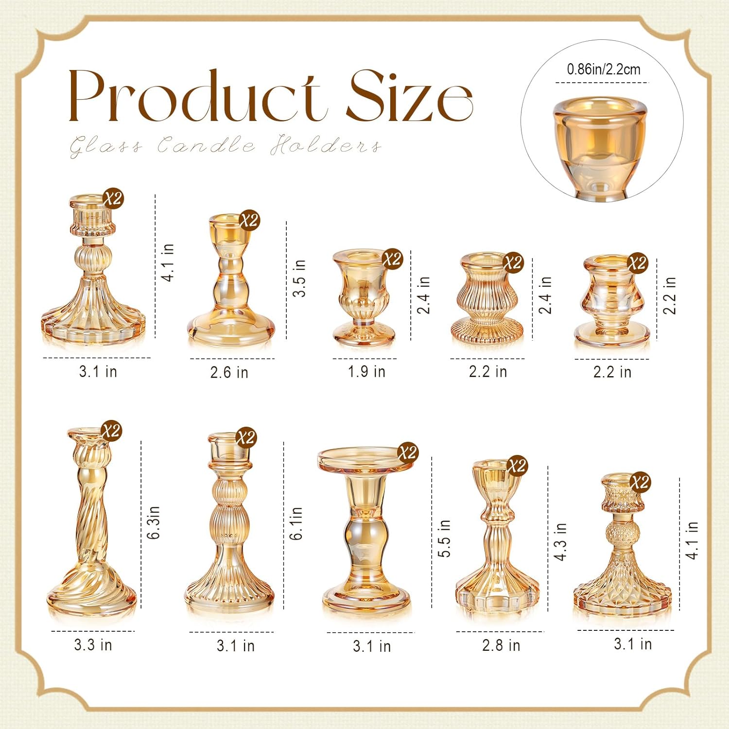 • Package Contents: you will receive 10 pieces 10 style gold glass candle holders in different sizes, which have different heights, smooth shapes and smooth finishes; The candlestick holder add a clean, simple, and elegant aesthetic to any space, it is suitable for a variety of candles