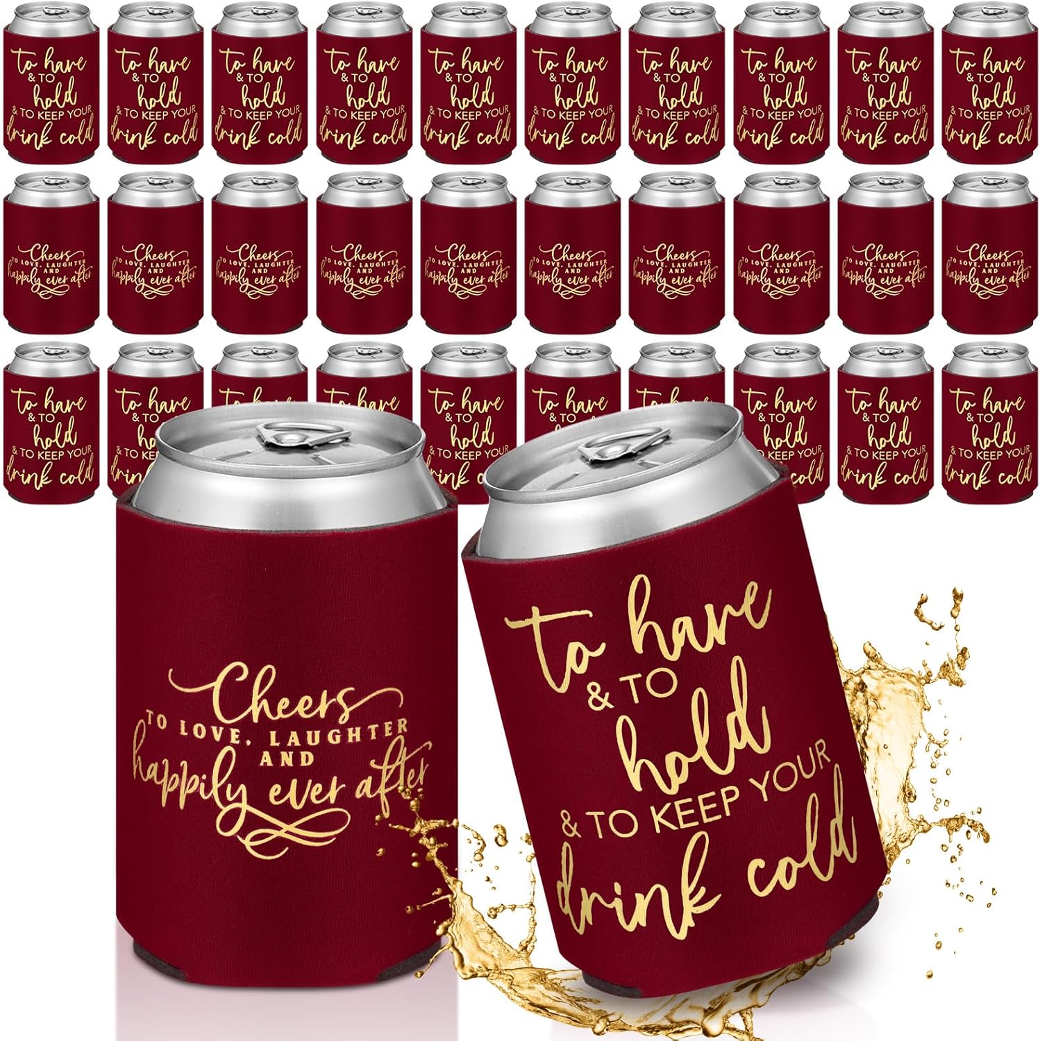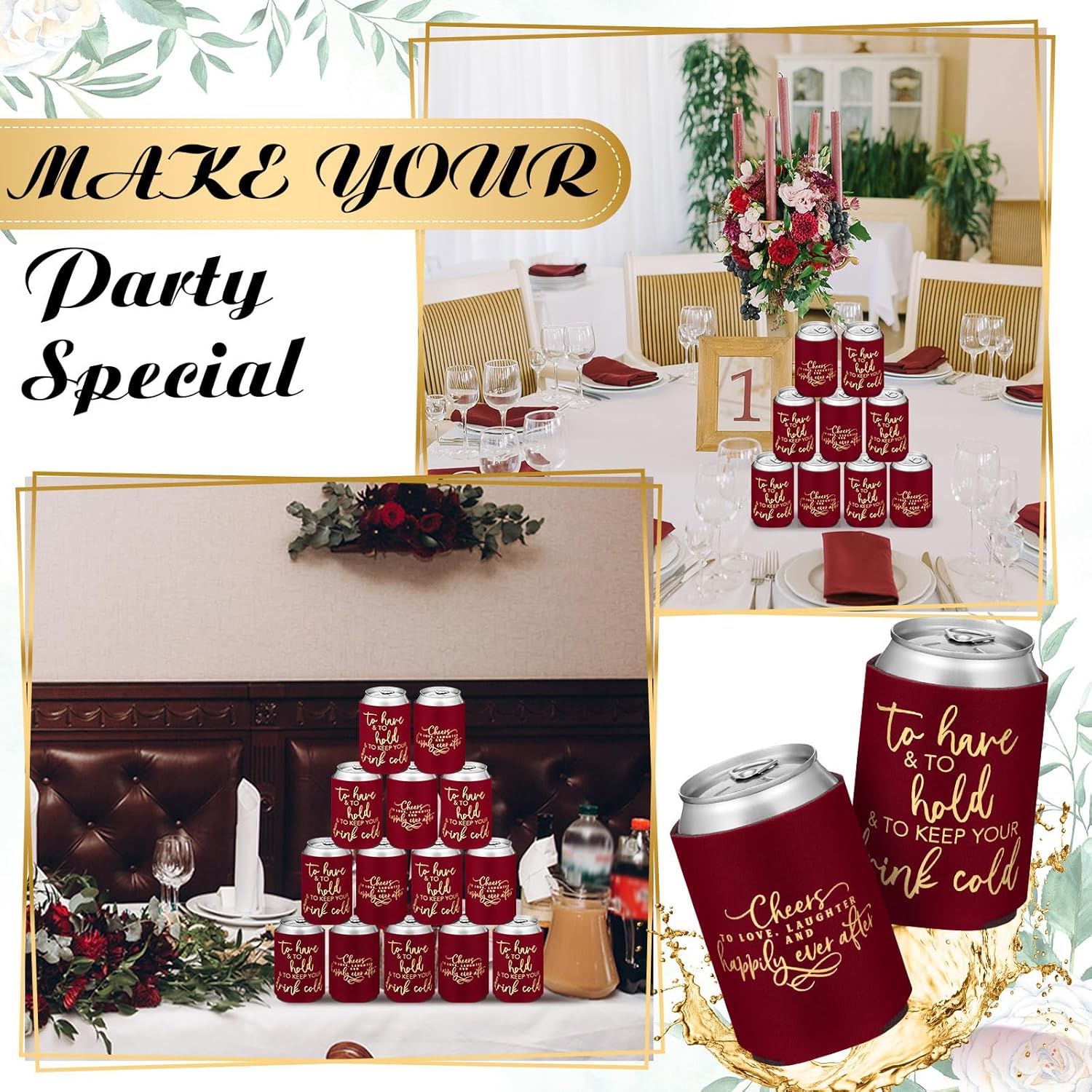 • Satisfying Party Package: our huge package containing 50 pieces of wedding can cooler decorations; Make every drink a celebration with our wine red and gold can coolers; They are suited to uplift the atmosphere at weddings, bridal showers, and bachelorette parties