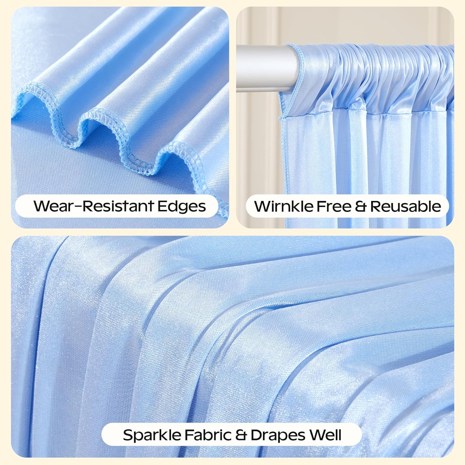 • Blue Shimmer Curtain Backdrop Package Included & Easy to install:The package included 2 Panels 5x10ft backdrop curtain,which can be arranged side by side to create a 10x10ft backdrop or used separately.Install way: Insert a rod or hang it on walls, ceilings, or temporary frames.