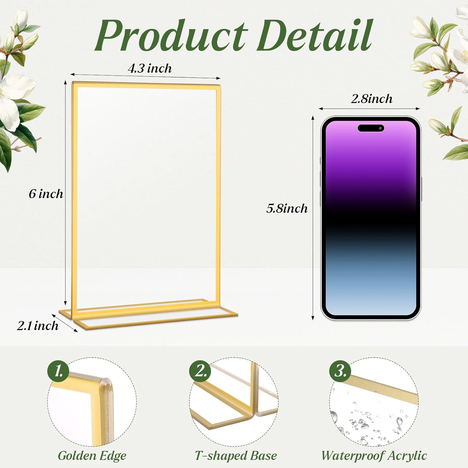 • Long-Lasting & Elegant: clear vertical acrylic frames are made from thick, crystal-clear acrylic for lasting clarity and durability, accented with a gold border that adds elegance to every setting