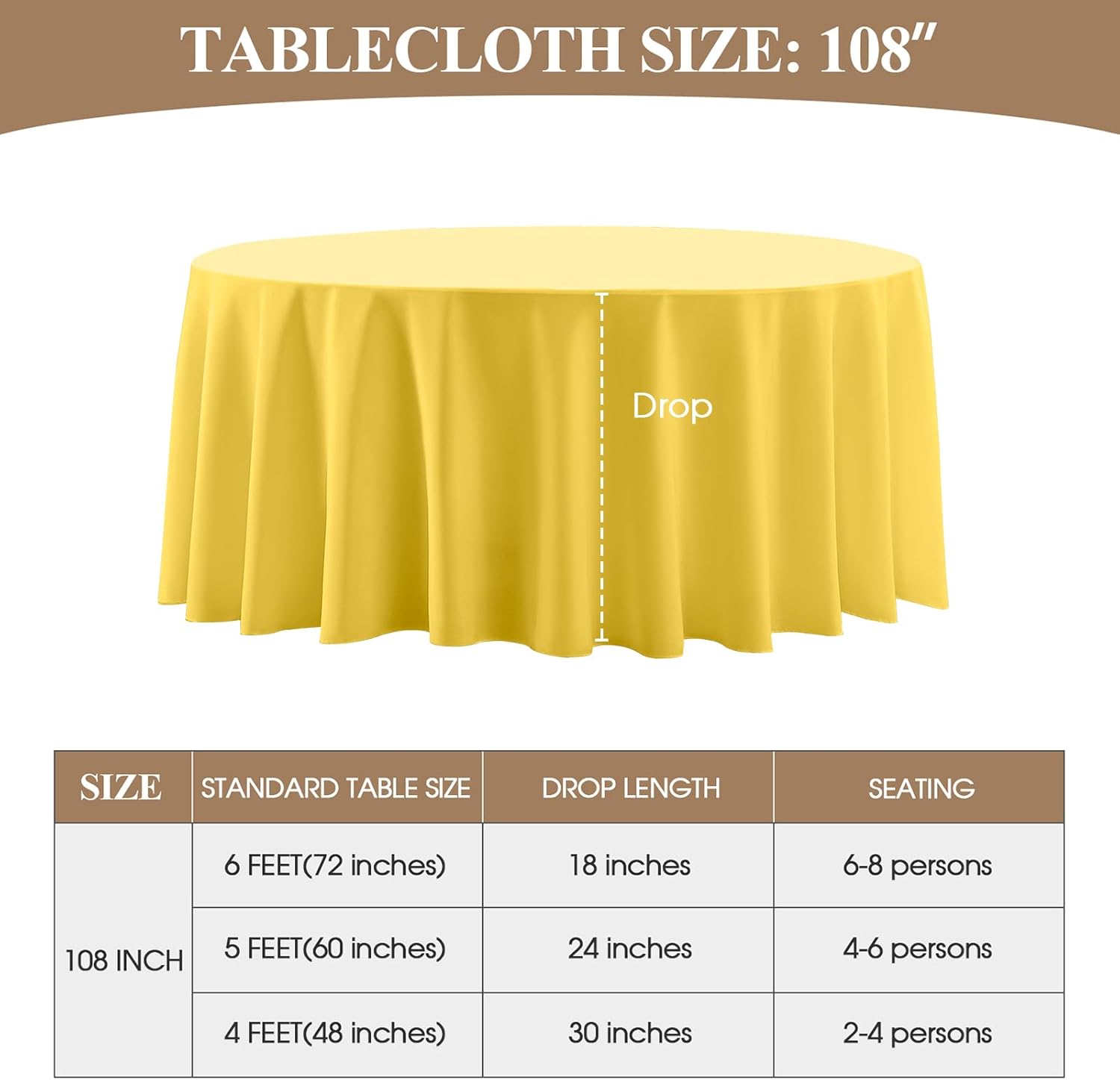 • Suitable Size: This polyester round tablecloth has multiple sizes to choose from, 90, 108, 120, 108 inches, which can meet the needs of tables of different sizes. In order to buy a tablecloth that is more suitable for your table, please measure the actual size of your table before purchasing and refer to our size chart