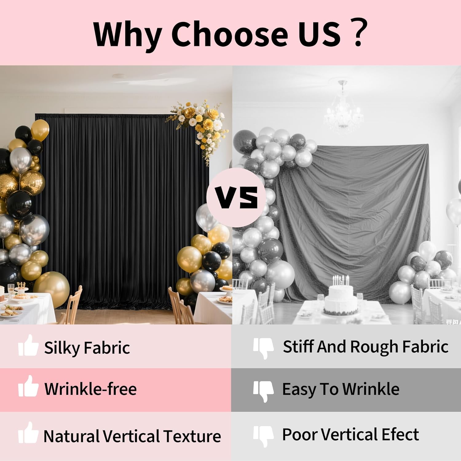 • Material: Backdrop curtains is made of high-quality polyester fabric, which has a soft texture, natural sagging, and is not easy to wrinkle. It can be tightened or stretched to determine the desired background width, perfectly decorating event or photo backgrounds