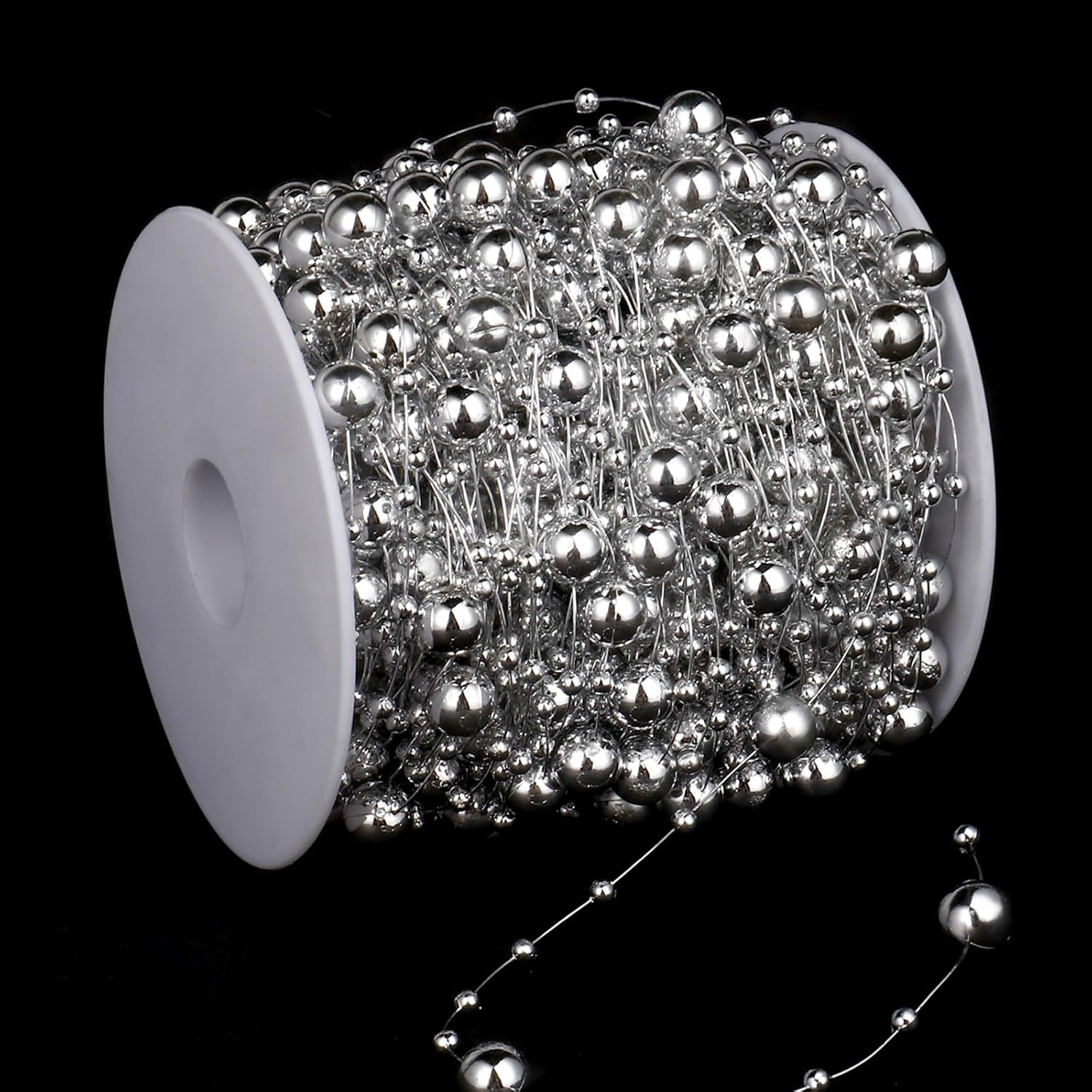 98FT Pearl Beads String Garland, 8mm 3mm Silver Faux Pearl Beads Roll Strand Bulk for Wedding Party Flower Christmas Decoration DIY Craft