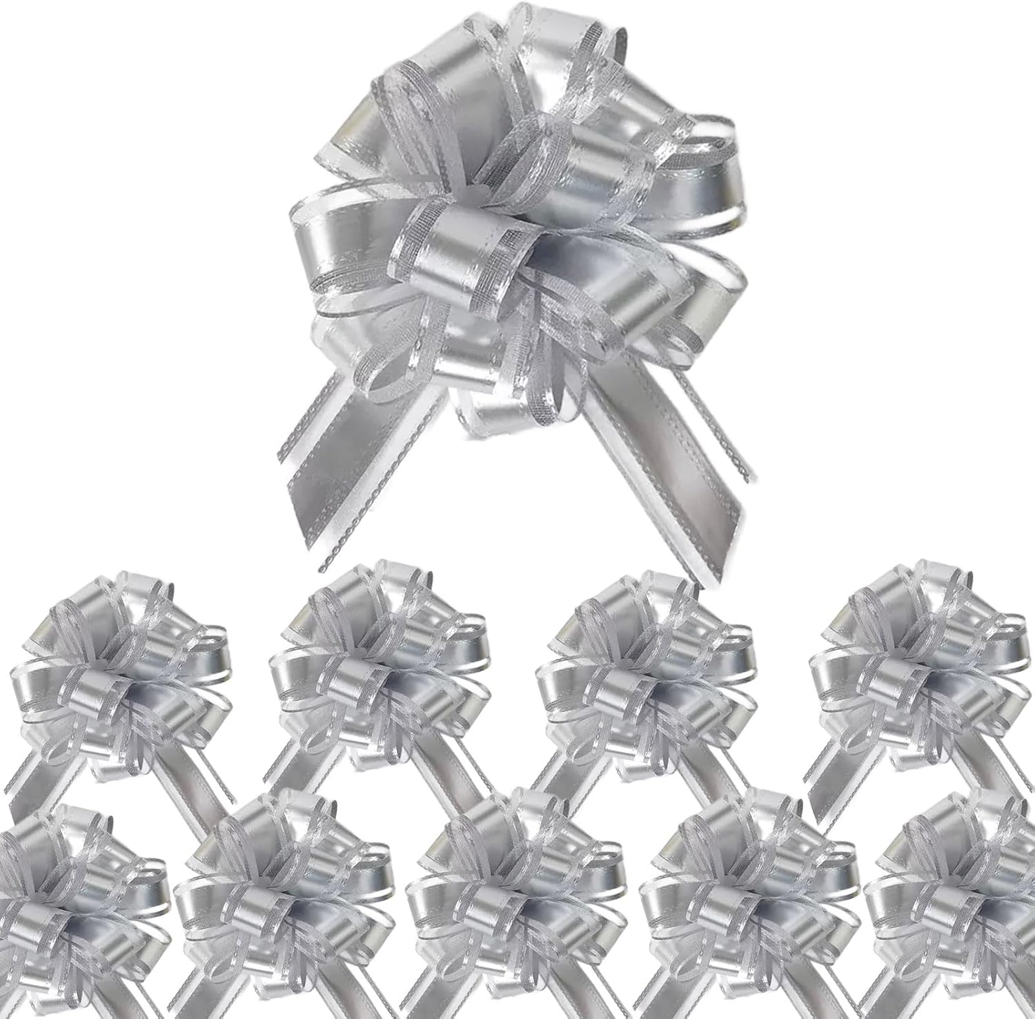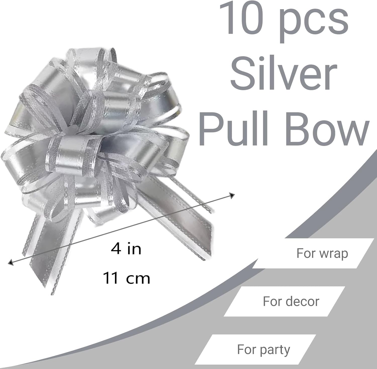 • PULL BOWS PACKAGE CONTENTS: Set of 10 elegant silver pull bows, each measuring 4 inches in diameter when fully assembled - perfect for gift wrapping and decorations