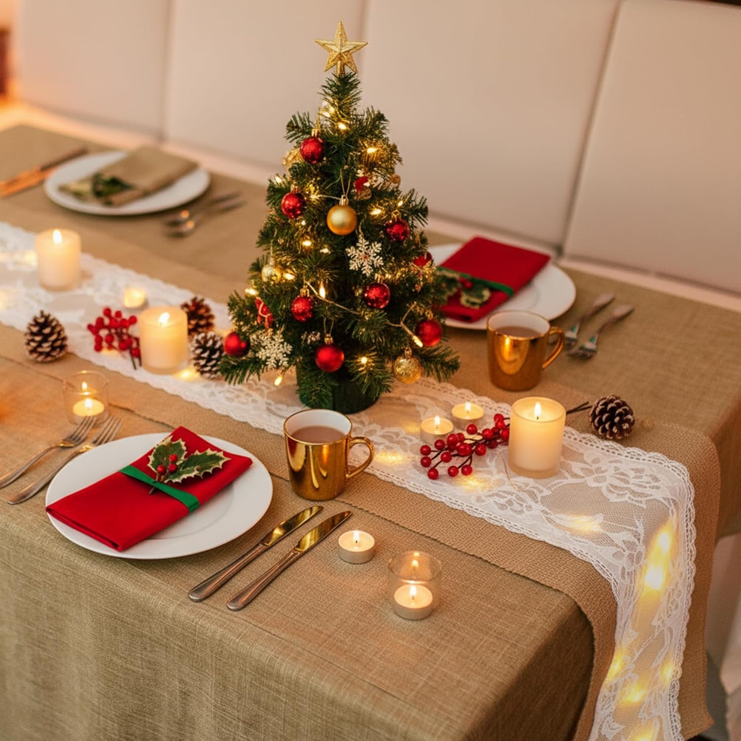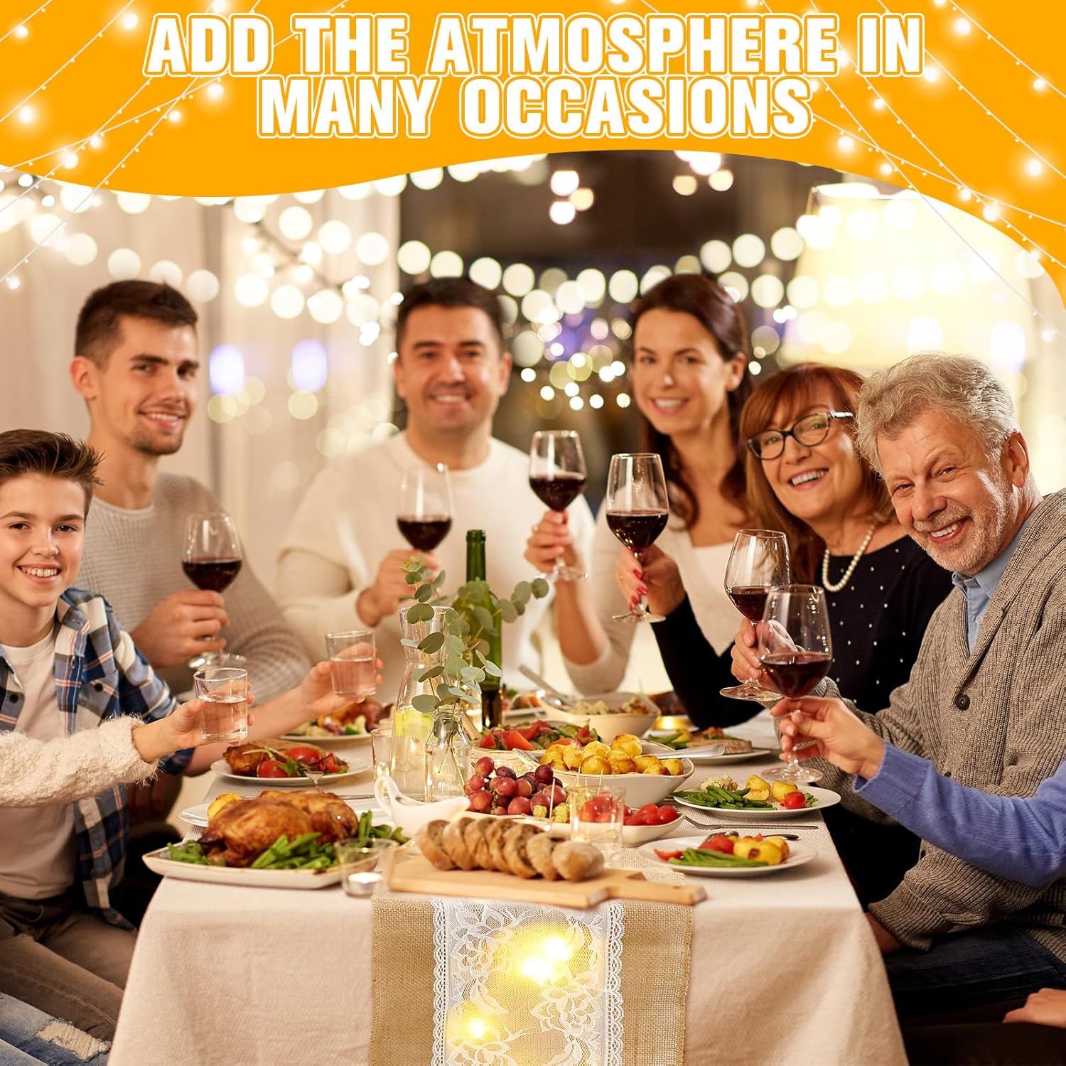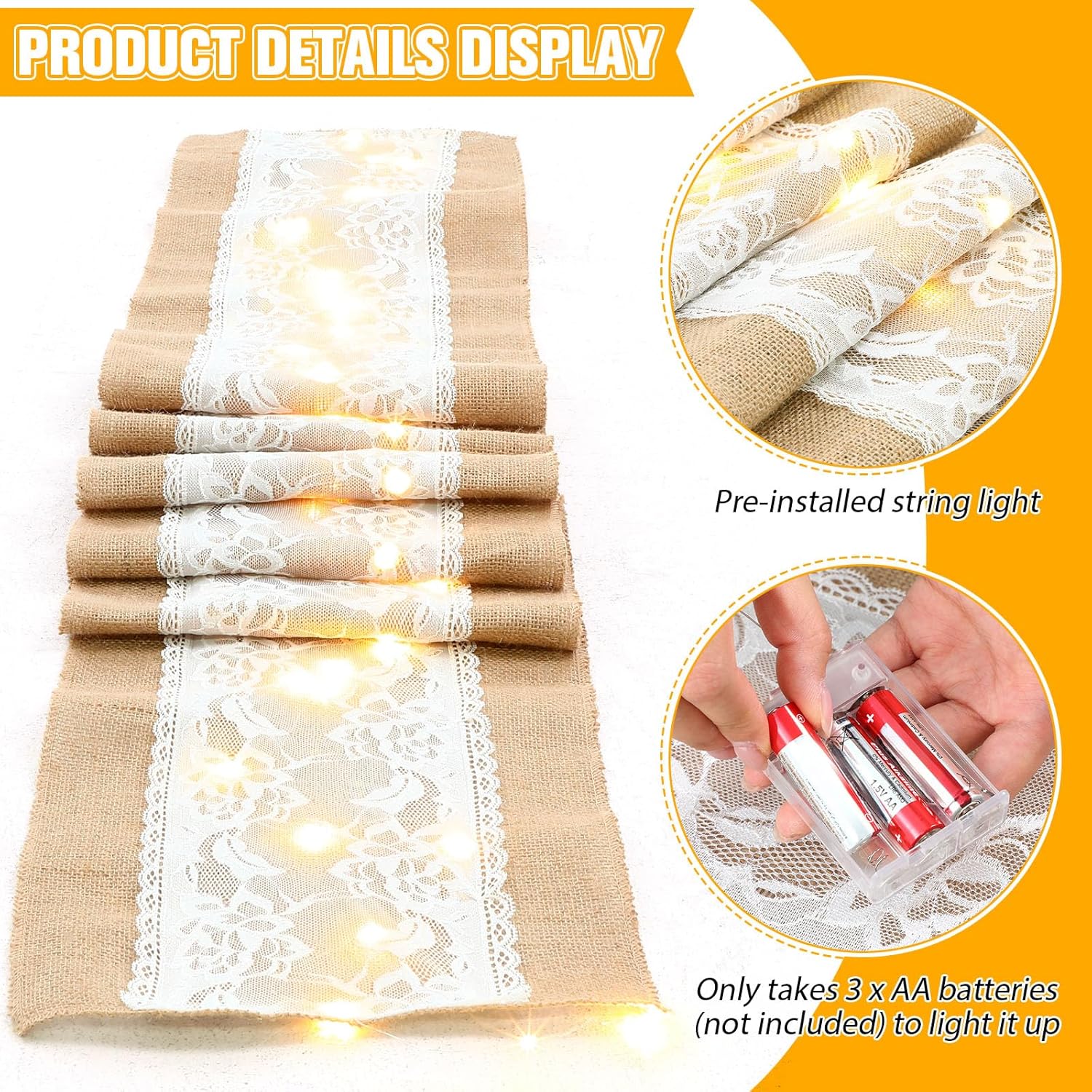 • Light-Up Rustic Elegance: Each burlap table runner features 40 hidden LED bulbs woven under lace, adding a warm glow to weddings, holiday dinners, or evening parties, creating a romantic and festive dining atmosphere