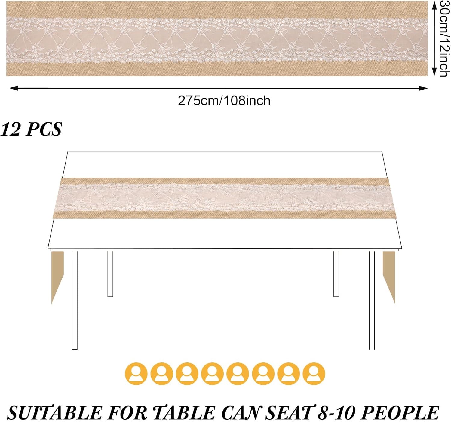 Xinnun 12 Pcs Burlap Table Runner with Lights 12 x 108 Inches Burlap Lace Table Runner Rustic Wedding Decorations Home Party (Vine)