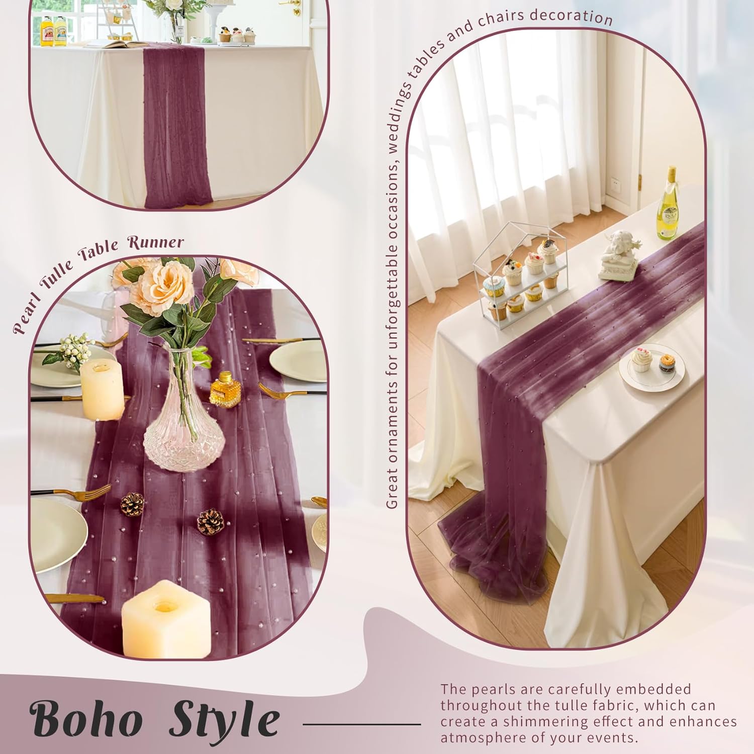 Pearl Table Runner 29 x 120 Inch Tulle Fabric Lace Table Runners Boho Rustic Tablecloth for Bridal Shower Birthday Party Wedding Arch Aisle Veil Dessert Table Decor(1 Pack, Burgundy)