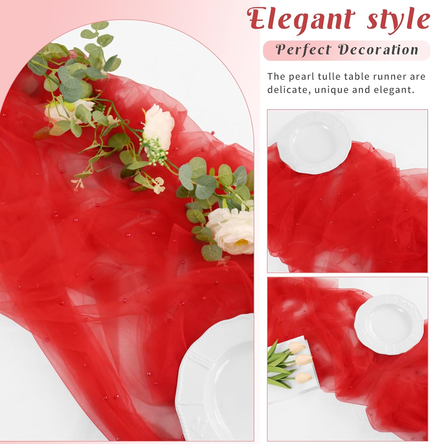 Set of 6 Pearl Table Runner 29 x 120 Inch Tulle Fabric Lace Table Runners Boho Rustic Tablecloth for Bridal Shower Birthday Party Wedding Arch Aisle Veil Dessert Table Decor(Red)