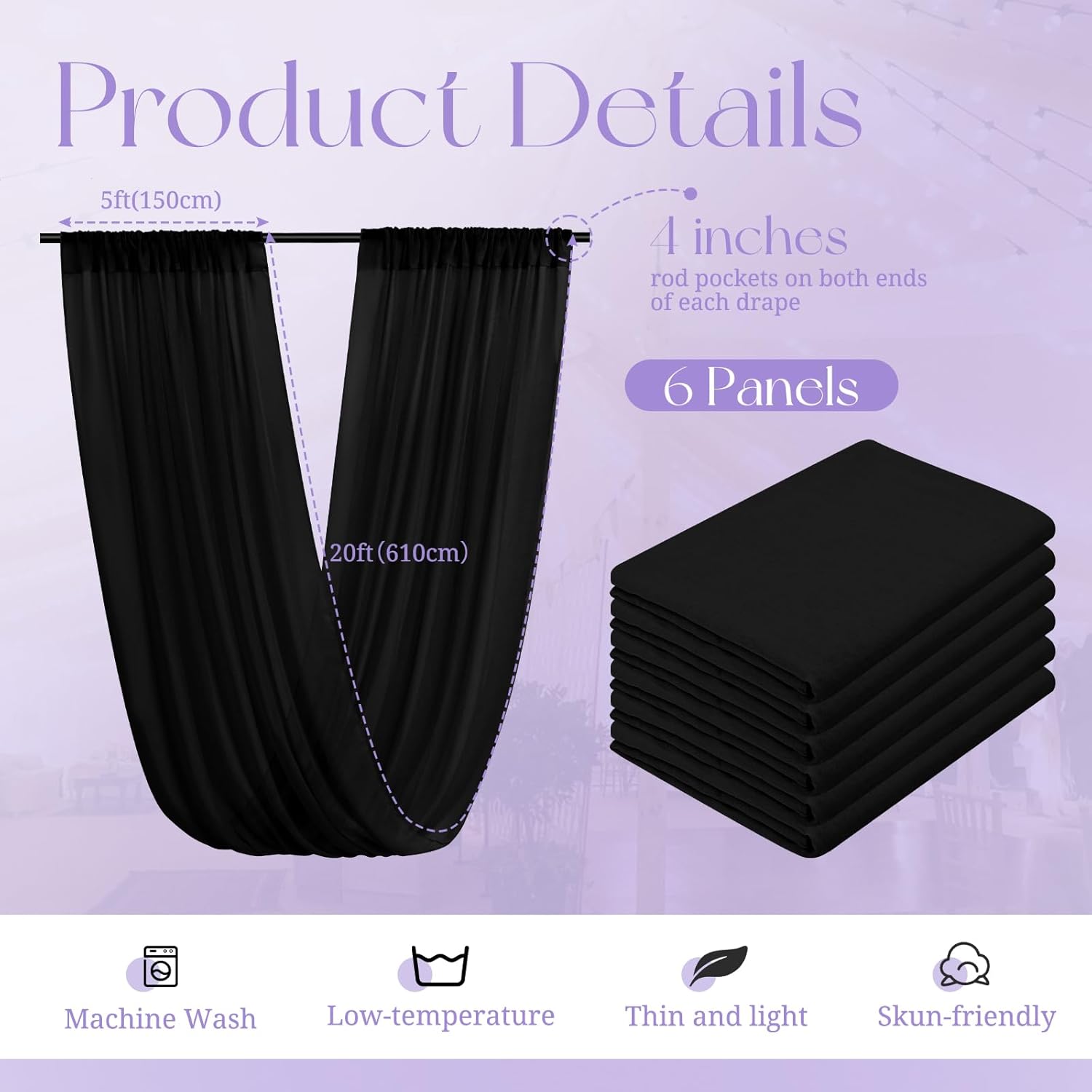 • 【Package Includes】The package will include 6 panels Black wedding ceiling drapes (Not include stand), each wedding extra long curtain measures 5 feet (60inch)wide x 20 feet(240inch) long.The sufficient quantity can meet your demands for decorating your weddings, parties, receptions.