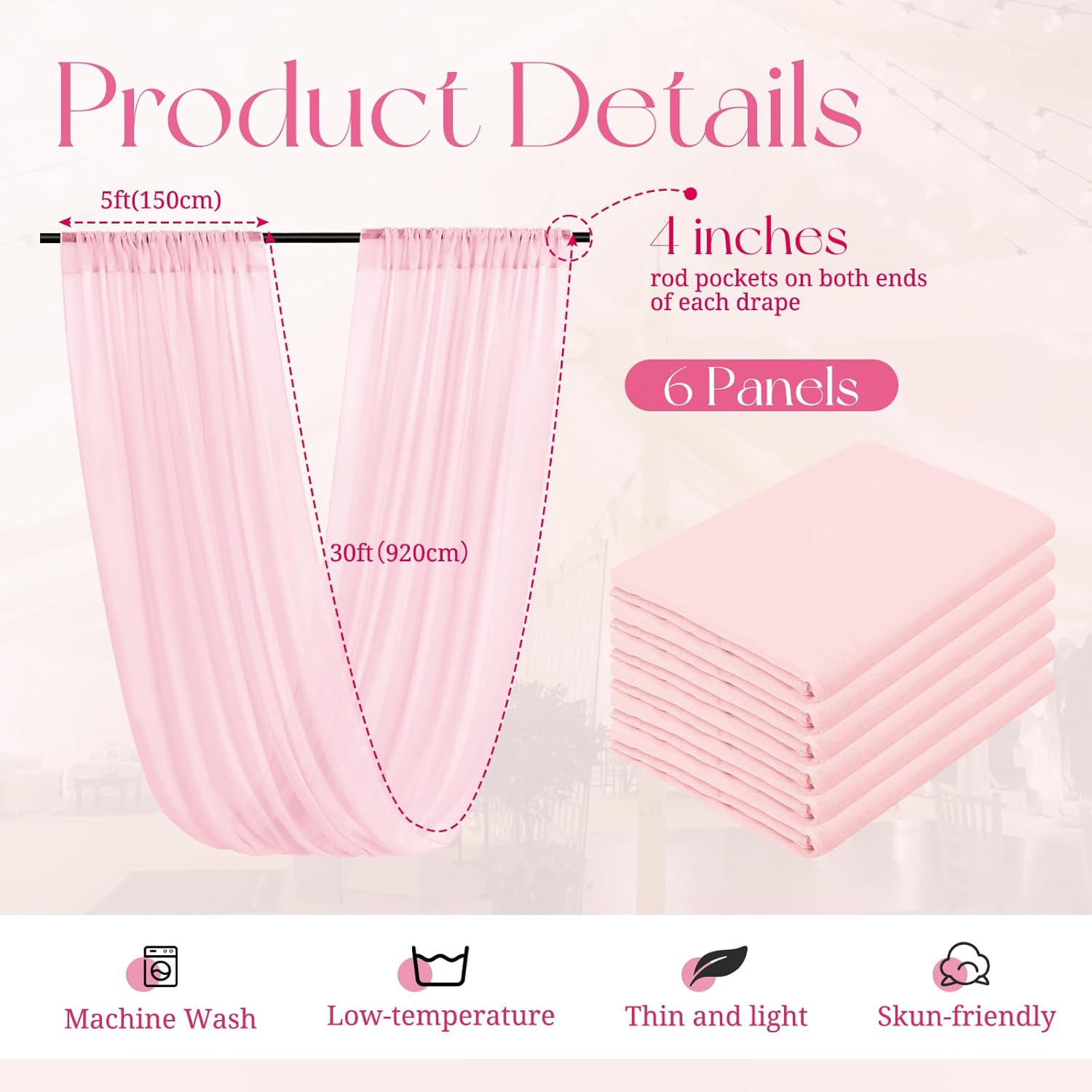 • 【Package Includes】The package will include 6 panels Pink wedding ceiling drapes (Not include stand), each wedding extra long curtain measures 5 feet (60inch)wide x 30 feet(360inch) long.The sufficient quantity can meet your demands for decorating your weddings, parties, receptions.