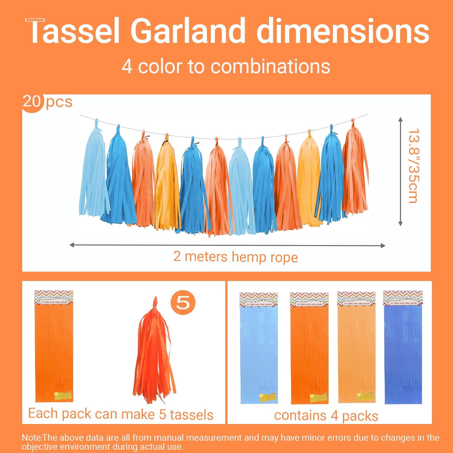 • PACKAGE CONTENTS: Set of 20 tissue paper tassels in navy ,light orange,orange red, blue, a 6-foot twine for easy hanging and instant decoration
