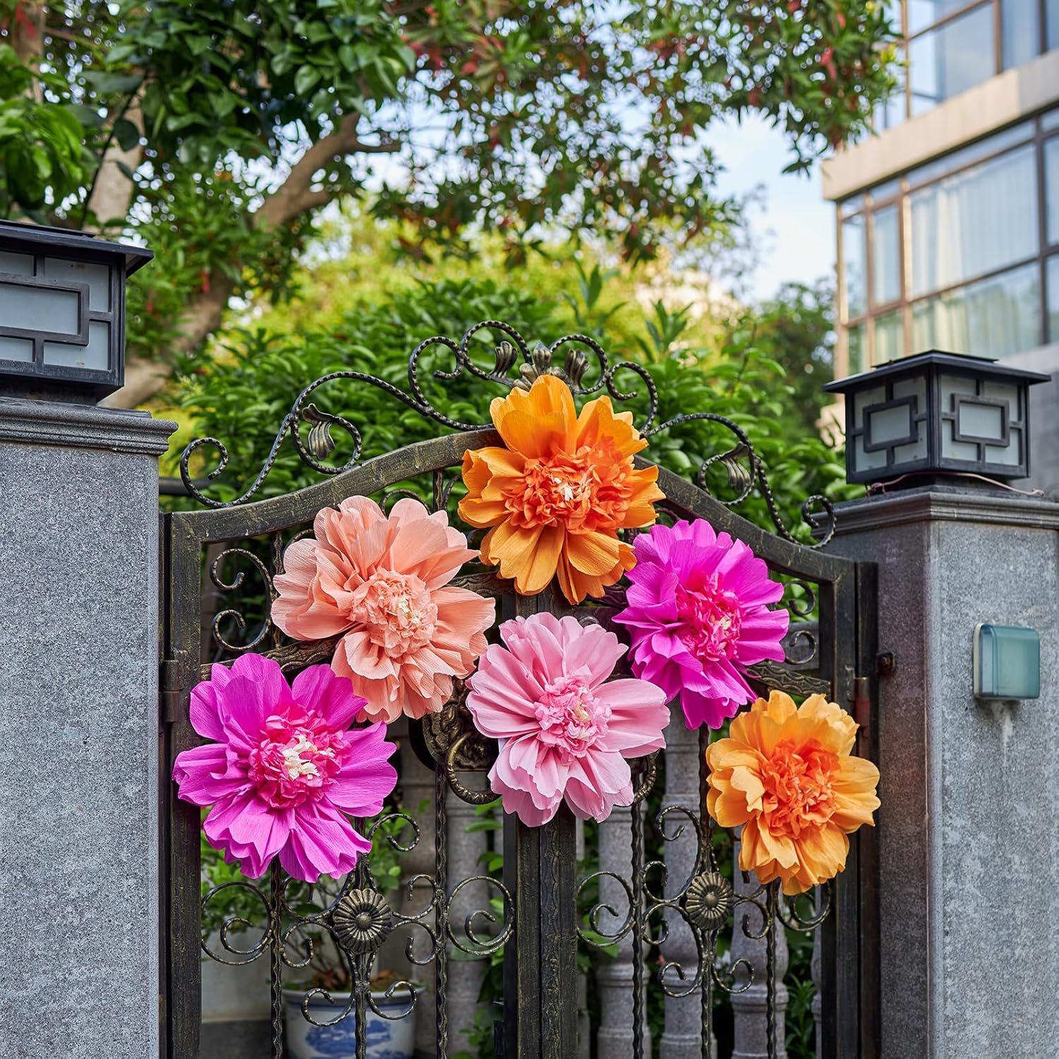• đŸŒș【COMPLETE FLORAL DECORATIONS SET】: This giant paper flower set includes 6 large paper flowers, offering everything you need to create a complete and vibrant floral display. Each bloom features 12-inch crepe paper petals with a layered tissue paper center in a mix of hot pink, pink, peach, and orange.