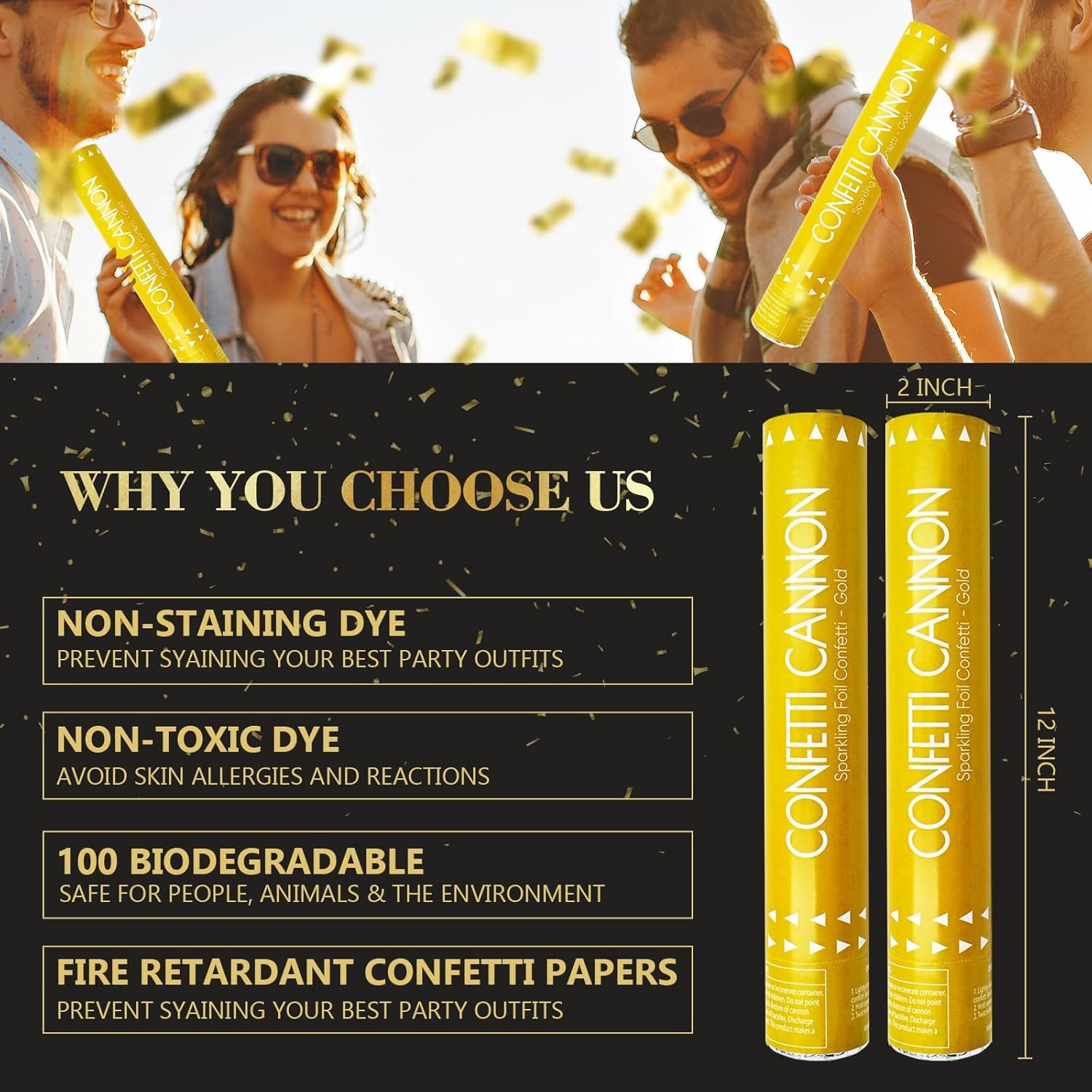 • ETERNAL MEMORIES - 12 pack gold confetti party poppers confetti shooters work well indoors and outdoors.After twisting the air compression canister at the bottom, the party poppers makes a wonderful explosion.Gold confetti cannon are great for adding fun, festive energy to any party or gathering. These confetti cannons bulk are perfect for any special event and any other holiday
