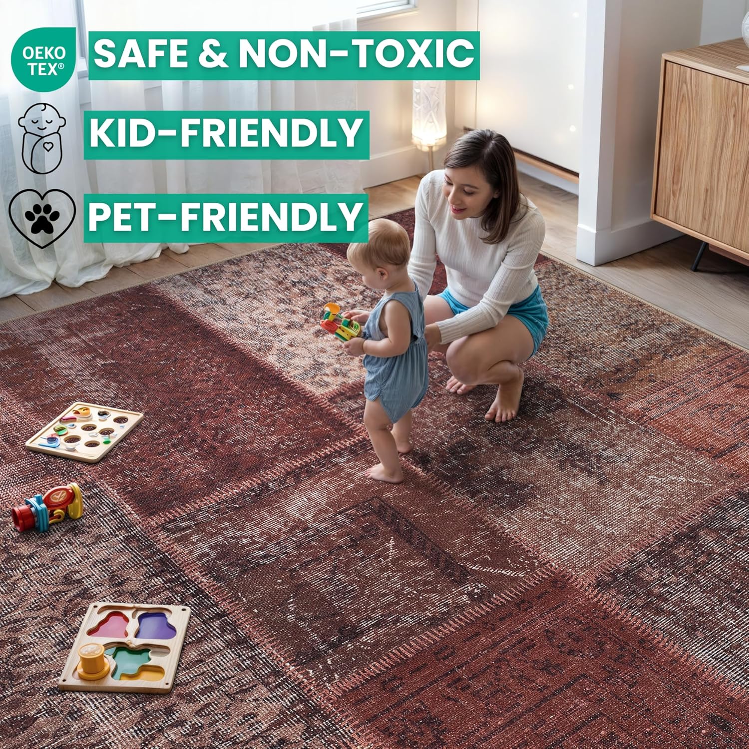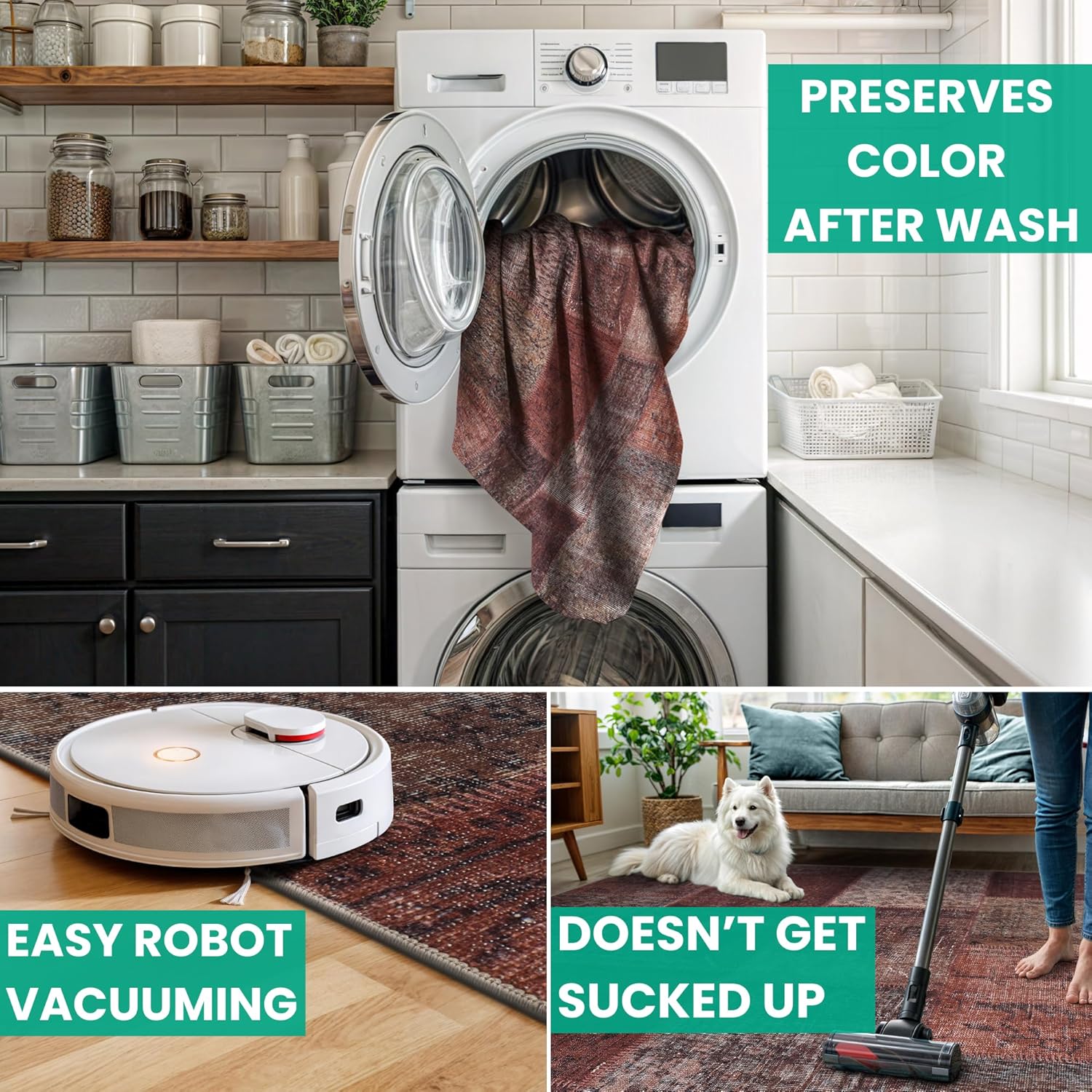 • MACHINE WASHABLE: Machine wash on delicate cycle (do not use bleach) at 85°F (30°C) and line dry or dry on air-only cycle without heat. Vacuum regularly and spot clean small stains. This easy to clean rug is perfect for families with kids and pets, and for high traffic areas.