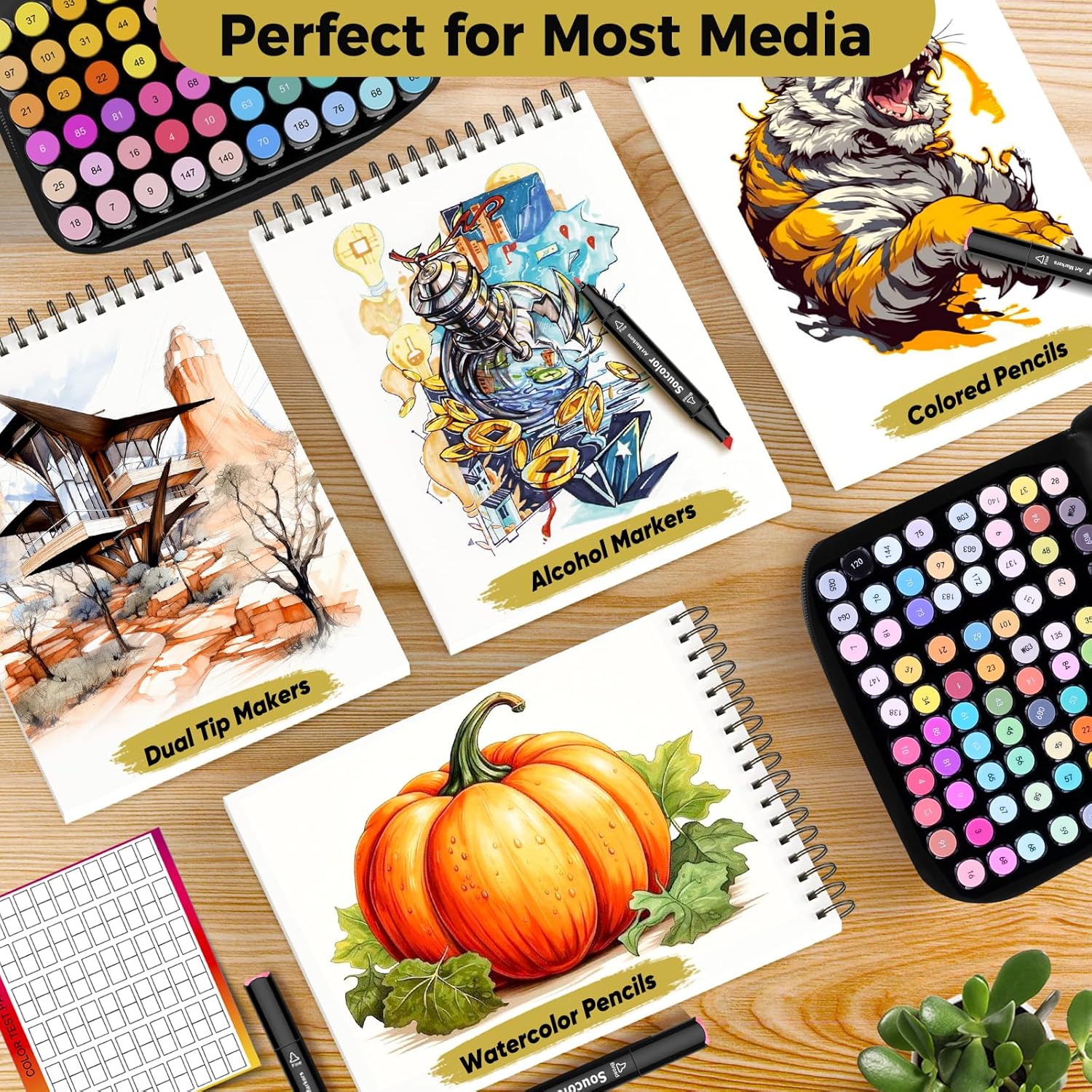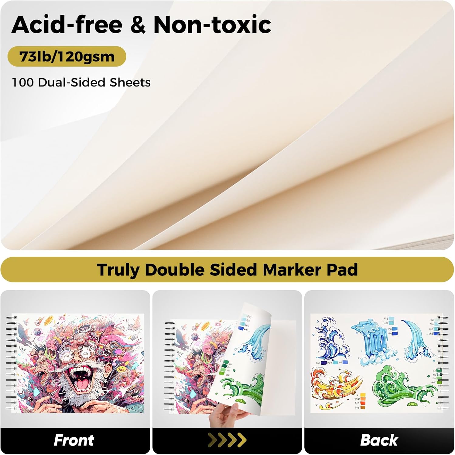 • Premium 120LB (200GSM) Marker Paper & Sketch Pad - Our professional-grade bleedproof sketchbook features a sturdy, sustainable white surface that handles alcohol markers, acrylic paint, and all artistic techniques without bleeding. The smooth texture works perfectly with sketching, coloring, and blending, while the double-sided design provides 200 usable pages (100 sheets) for extended creativity.