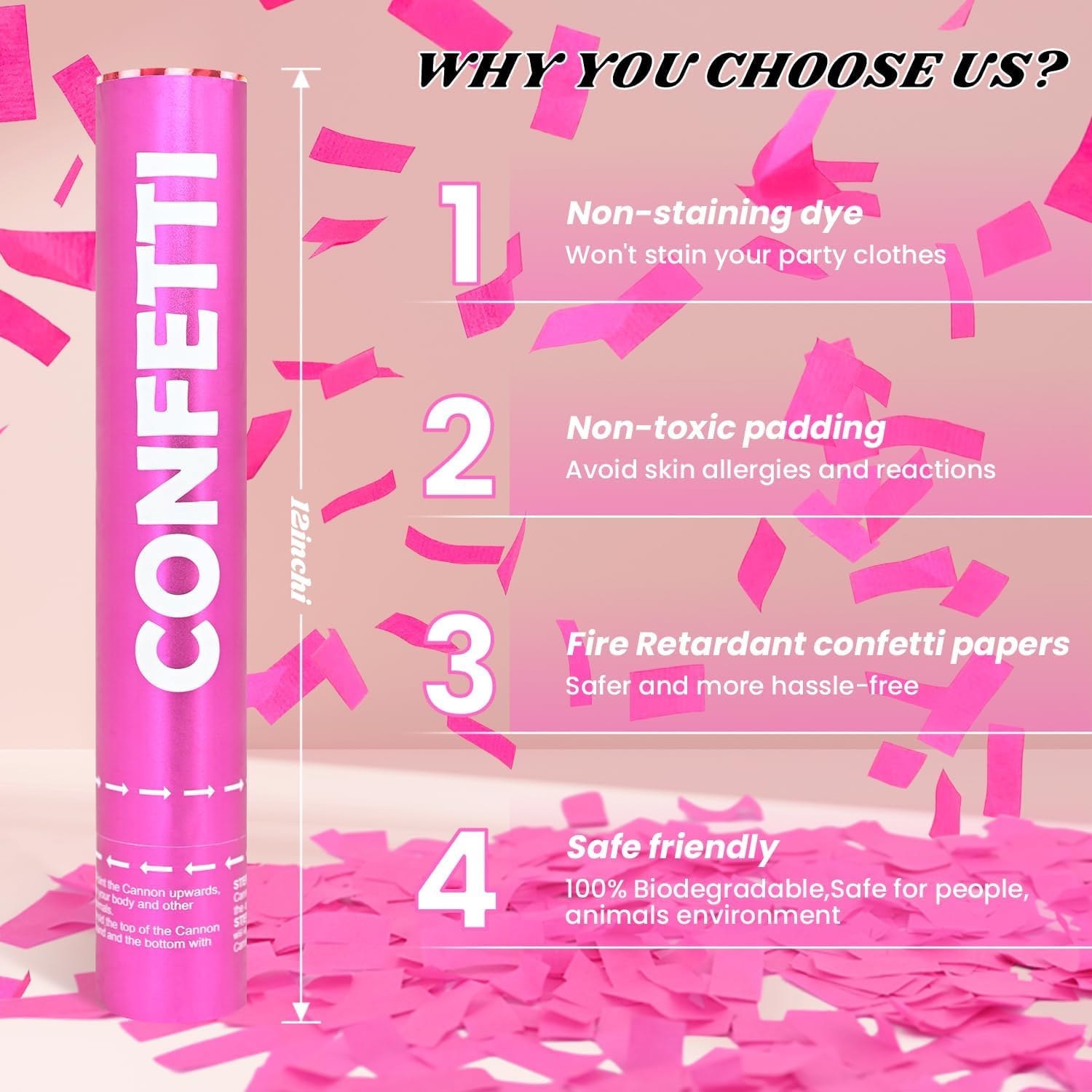 • 【Safe & Easy to Use】Our pink biodegradablel confetti cannon kit contains pink paper confetti are green, non-toxic. Biodegradable party poppers confetti shooters work well indoors and outdoors easy to clean and 100% safety, you and your guests can enjoy confetti cannon for your celebrations party.Just give each confetti cannon a hard twist and let the magic happen!